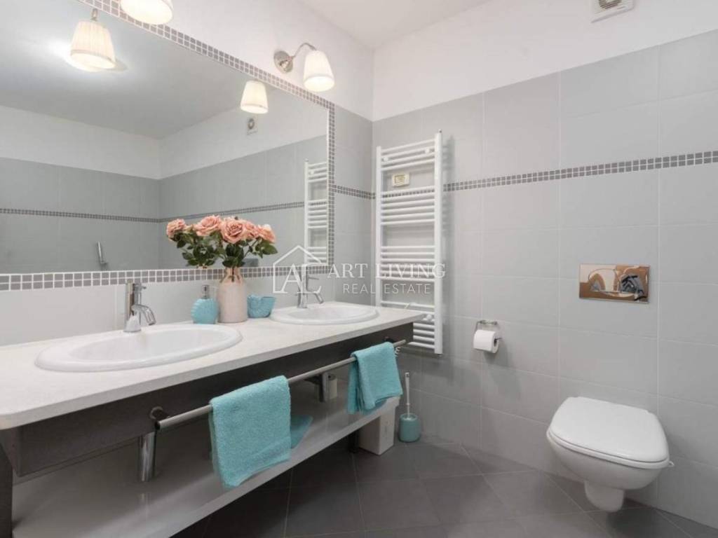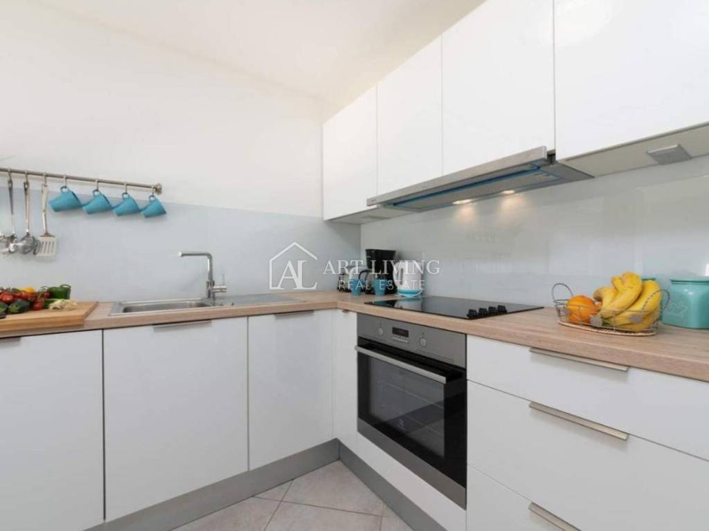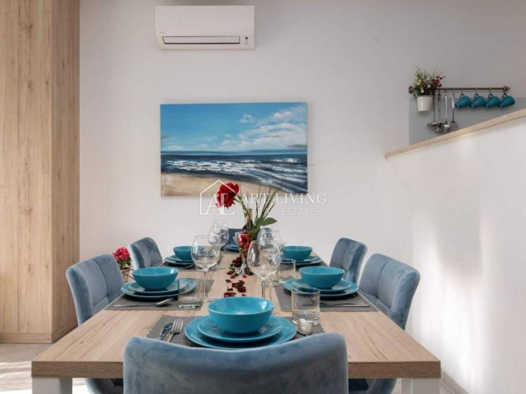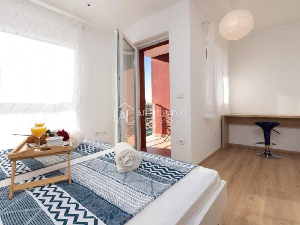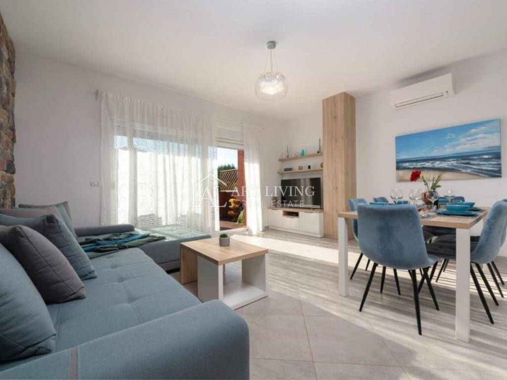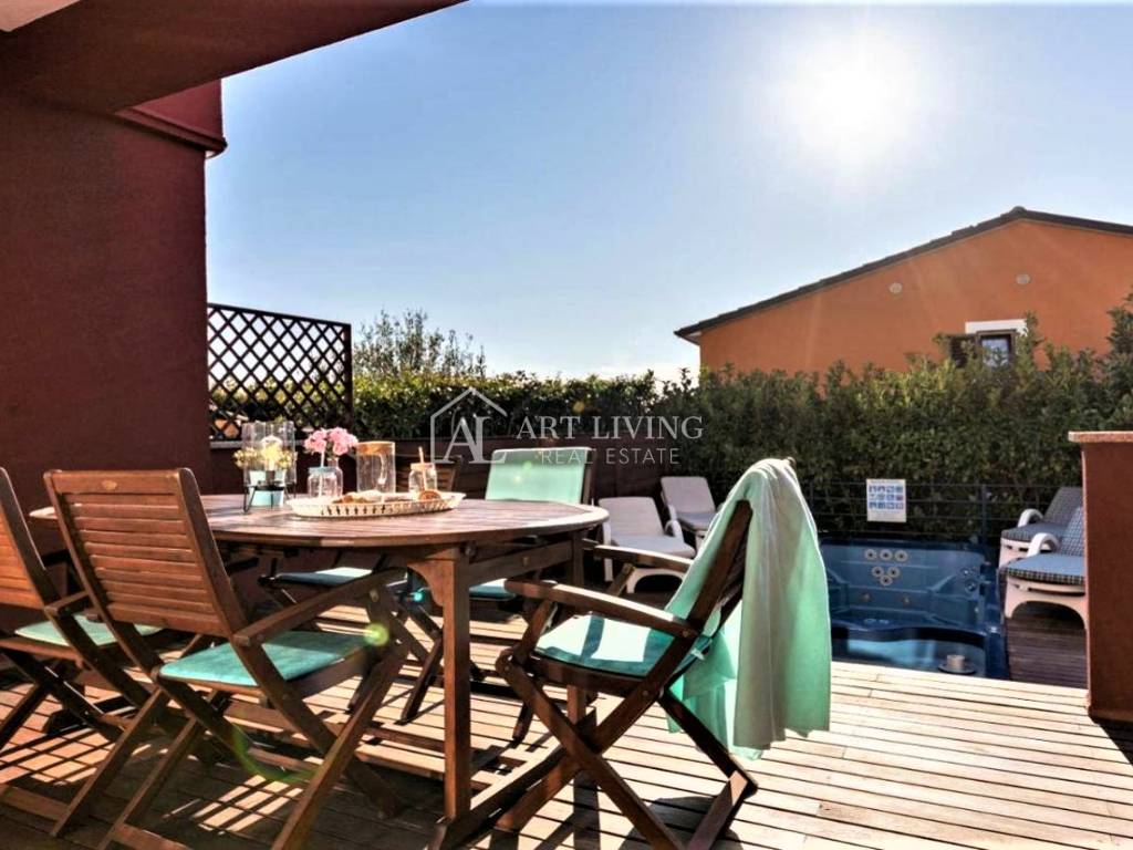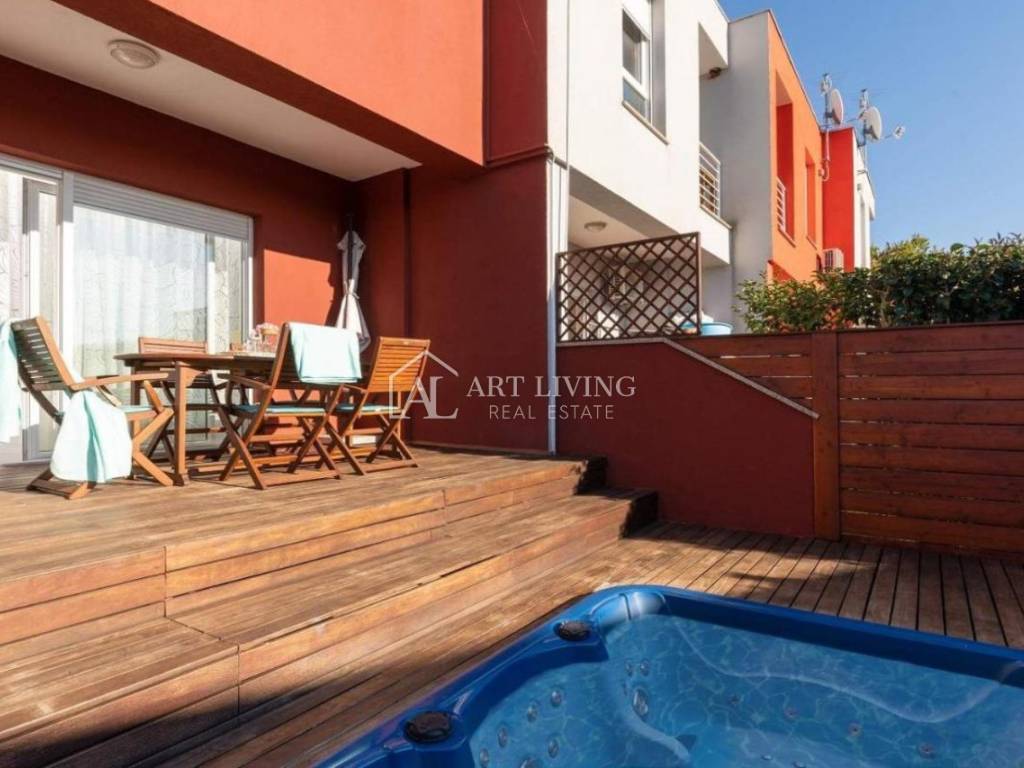 Prodaje se moderna kuća u nizu s bazenom, u mirnom naselju na atraktivnoj lokaciji na samo 2 km od obližnjih plaža Kanegre, golf centra i Kempinski resorta. Udaljenosti od grada Umaga 5 km, Novigrada 20 km od graničnog prijelaza sa Slovenijom 7 km, aerodroma Portorož 10 km i 40 km od zračne luke Trst.