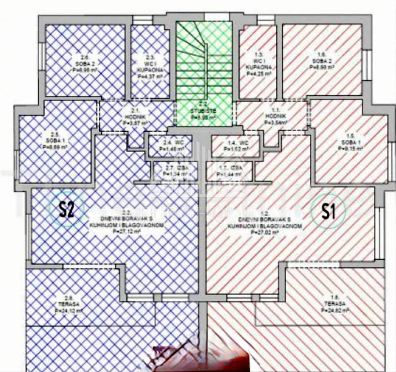 U prizemlju zgrade prodaje se odličan trosoban stan oznake S2 ukupne neto obračunske površine 59,26 m2 . Stan se sastoji od ulaznog hodnika, otvorenog koncepta kuhinje, blagovaonice i dnevnog boravka, ostave u kojem se nalazi bojler, kupaonice, wc-a, dvije spavaće sobe i natkrivene terase.