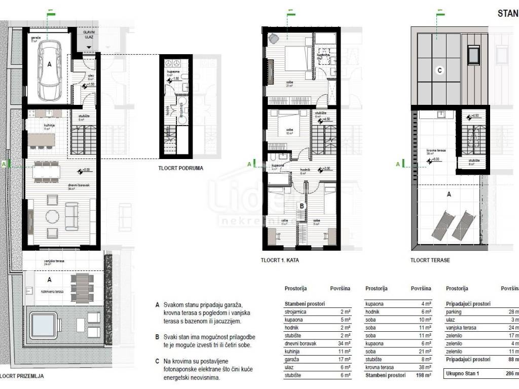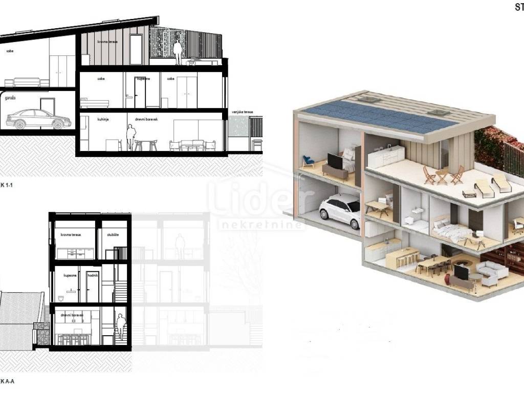 Projekt Kostrena sastoji se od dvije dvojne kuće dizajnirane da vlasnicima omoguće više od samo komfornog načina života. Nalazi se u dijelu “Zelene Kostrene” sjeverno od magistrale odakle se pruža prekrasan pogled na cijeli Kvarner. U neposrednoj blizini nalaze se dječje igralište i crkva Svete Lucije, a na 3 minute hoda knjižnica Kostrena. Pristup kućama uređen je s gornje ceste gdje se planira proširenje postojeće prometnice. Svakoj kući pripadaju dva vanjska parkirna mjesta i garaža u sklopu objekta. Svaka kuća sastoji je od dva stana, smještena jedan pored drugoga na tri etaže. Stanovi su zrcalnog tlocrta i neto površina od 196 m2 do 198 m2. Svaki stan ima ugrađeno podno grijanje, fan coil hlađenje i dizalicu topline. Za svaki stan postoji mogućnost odabira završnih materijala. Svakom stanu pripadaju krovna terasa s pogledom i vanjska terasa s bazenom ili jacuzzijem. Na krovovima su postavljene fotonaponske elektrane što čini kuće energetski neovisnima. Svakom stanu pripada garaža gdje je postavljena priprema za punjenje električnih automobila, što daje dodatnu vrijednost. Rok završetka je prosinac 2024. ..