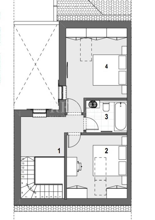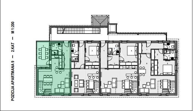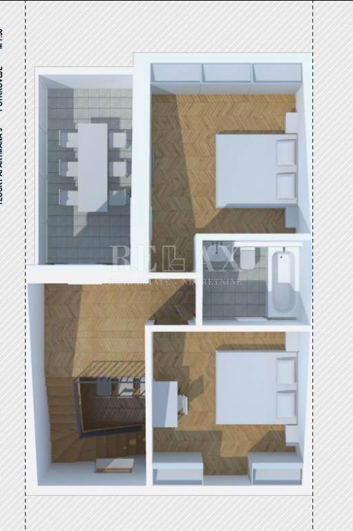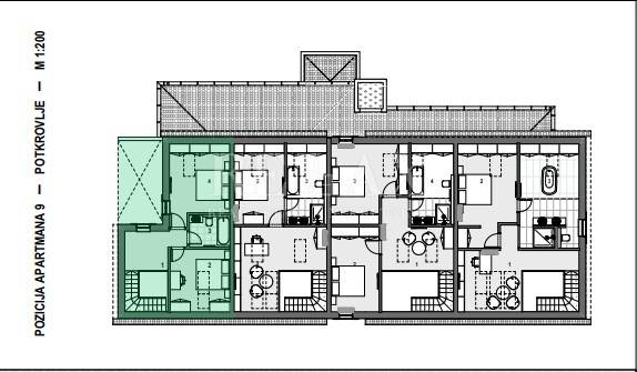 Stan se nalazi na 2. katu i potkrovlju, sastoji se od ulaznog hodnika, kupaone, kuhinje s blagovaonom i dnevnim boravkom. Unutarnjim stubištem se penjemo u potkrovlje gdje dolazimo u predsoblje od kuda se ide u kupaonu i dvije spavaće sobe.