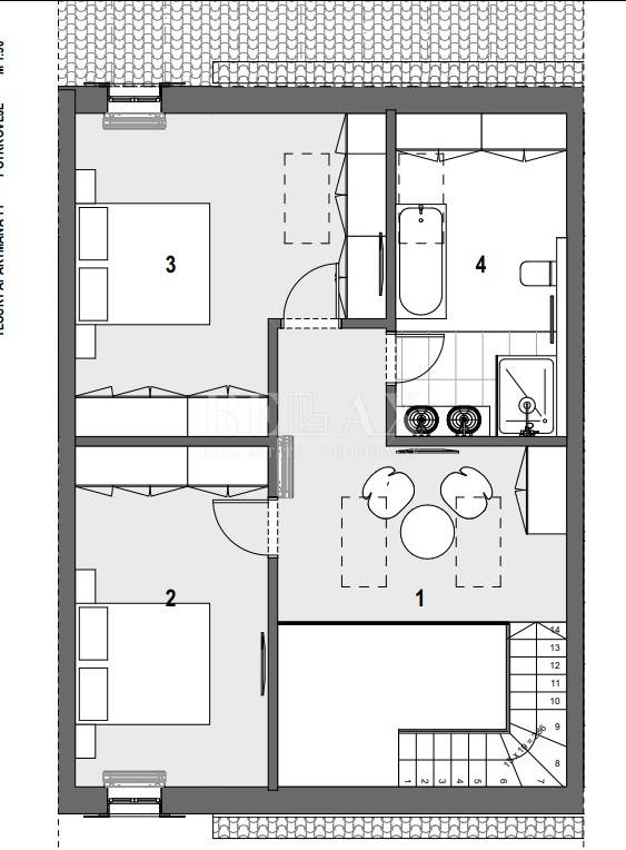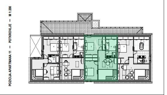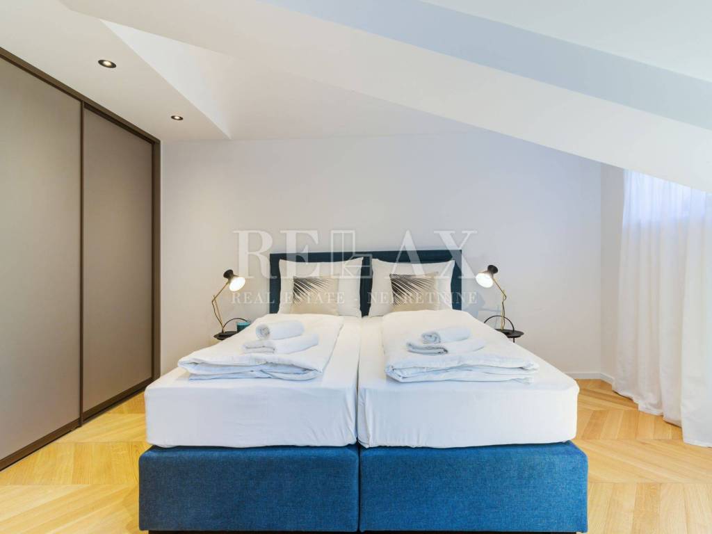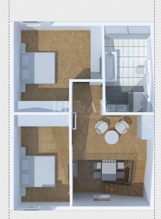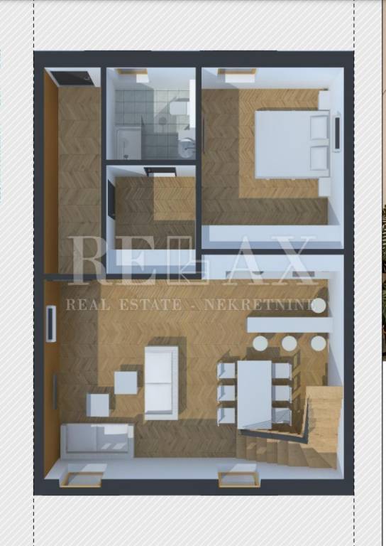 Ovaj komforan stan prodaje se kompletno namješten. Stan se sastoji od ulaznog hodnika, spavaće sobe, kupaone, open space kuhinje sa blagovaonicom i dnevnim boravkom od kuda se stepenicama penjemo u visoko potkrovlje gdje dolazimo u predsoblje od kuda se ide u kupaonicu i dvije spavaće sobe.