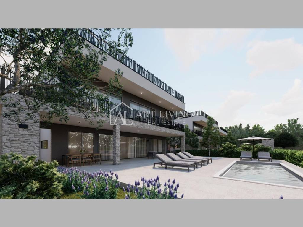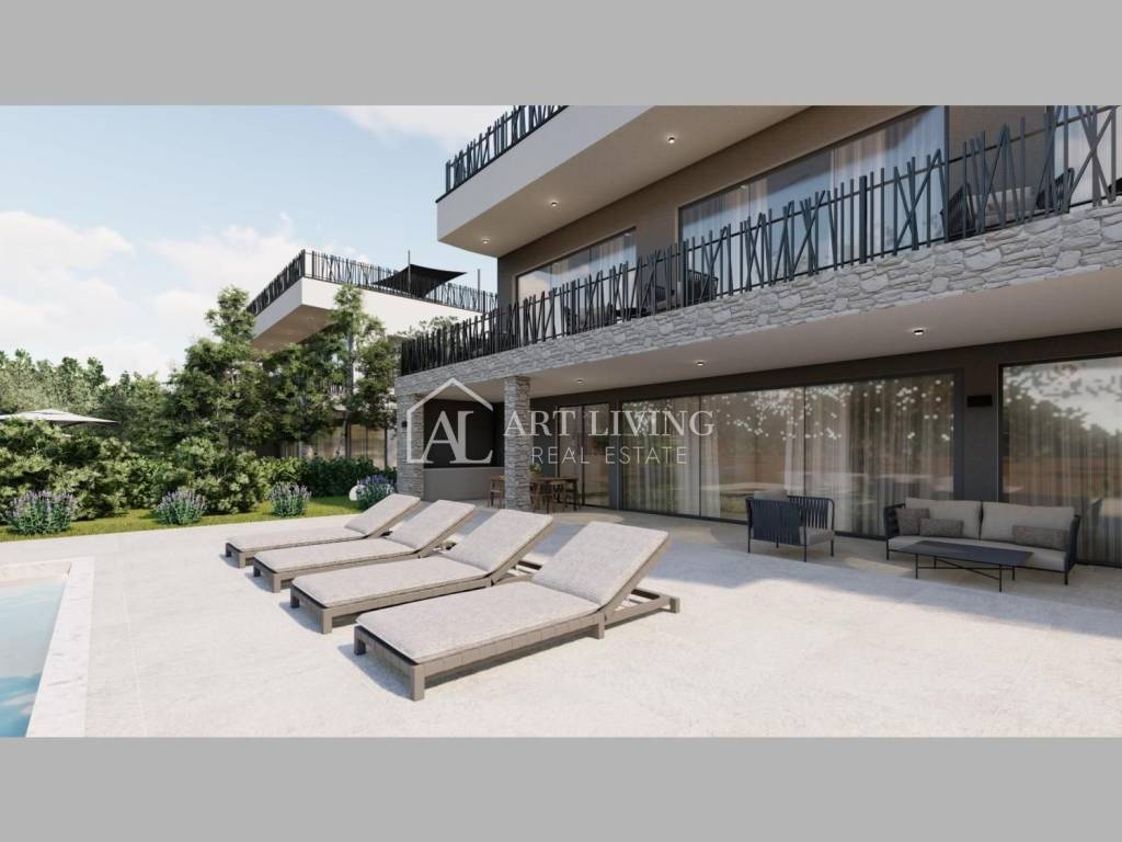 Iz dnevnog boravka pristupa se direktno na lijepo uređenu i natkrivenu terasu te bazenu i sunčalištem.