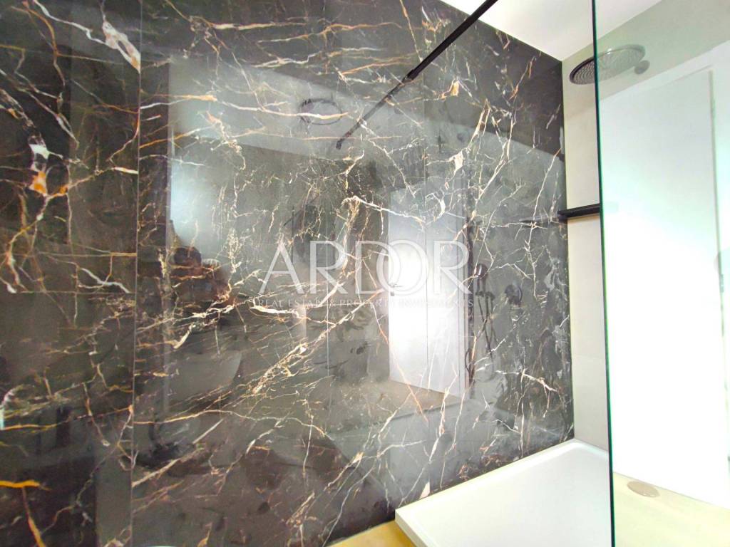 Na prvom katu se nalaze još tri spavaće sobe, dvije kupaonice, veliki walk-in garderobni ormar te izlaz iz dvije sobe na veliki balkon sa kojeg se pruža pogled na Kvarner.