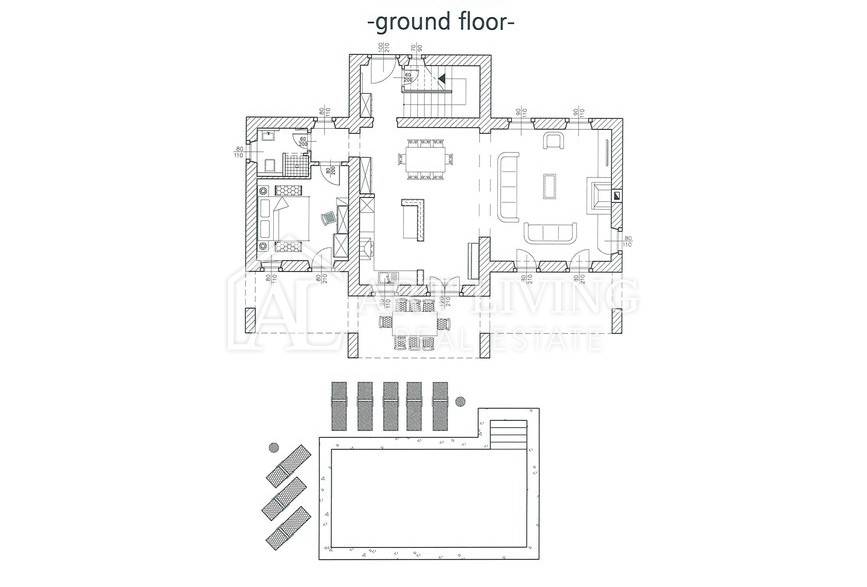 U prizemlju kuće smješteni su ulaz, dnevni boravak, kuhinja, blagovaonica otvorenog tipa, spavaća soba s izlazom na natkrivenu terasu i kupaonica. Iz dnevnog boravka i blagovaonice otvorenog tipa pristupa se direktno na natkrivenu terasu, sunčalište te na bazen i uređeno dvorište