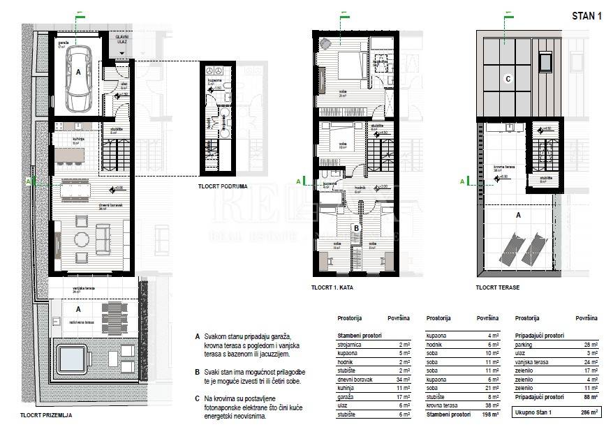 Stan je raspoređen na tri etaže : podrum, prizemlje i prvi kat. U prizemlju stana su smješteni dnevni boravak, kuhinja, te vanjska terasa. U podrumu se nalazi kupaona i kotlovnica. Na prvom katu su smještene četiri sobe i kupaonica. Sa prvog kata se izlazi na krovnu terasu sa predivnim panoramskim pogledom na more.