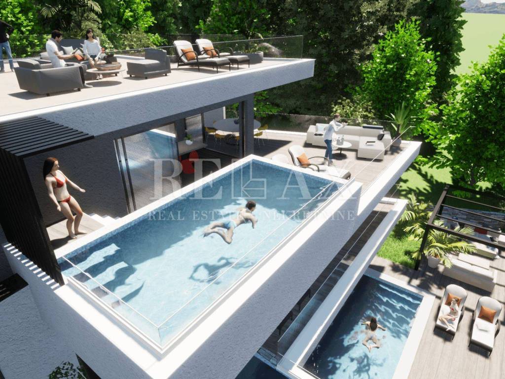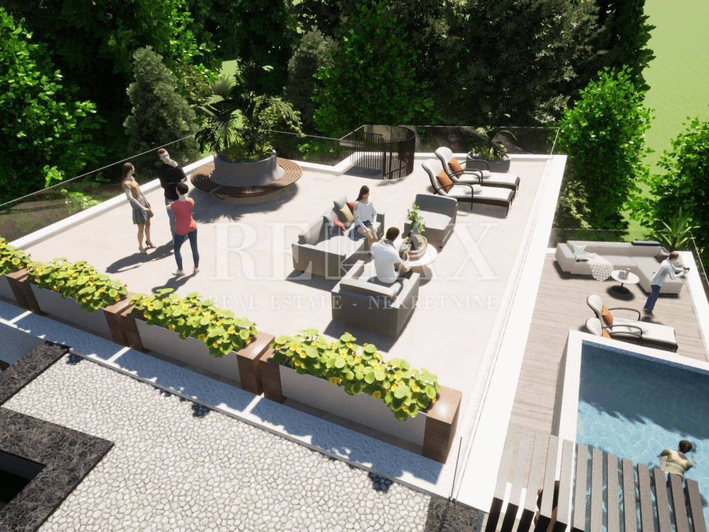 Ova raskošna rezidencija obuhvaća 98 m2 unutarnjeg prostora, 65 m2 vanjskog prostora na kojem se nalazi grijani bazen od 17 m2, te impresivnu krovnu terasu od 80 m2, pružajući ekskluzivni prostor i nezaboravno iskustvo stanovanja na visokoj razini.