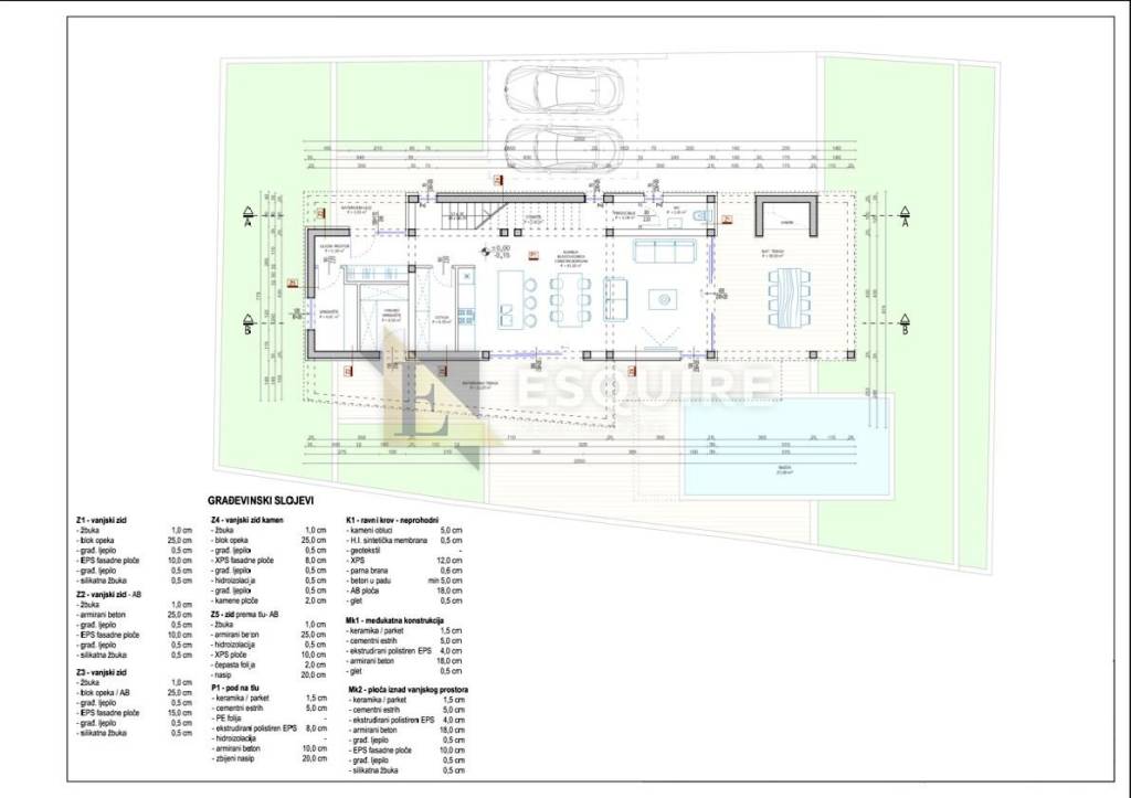 Prizemlje: dnevni boravak + kuhinja + blagovaona, predsoblja, strojarnice, wc-a, ostave i natkrivene terase.