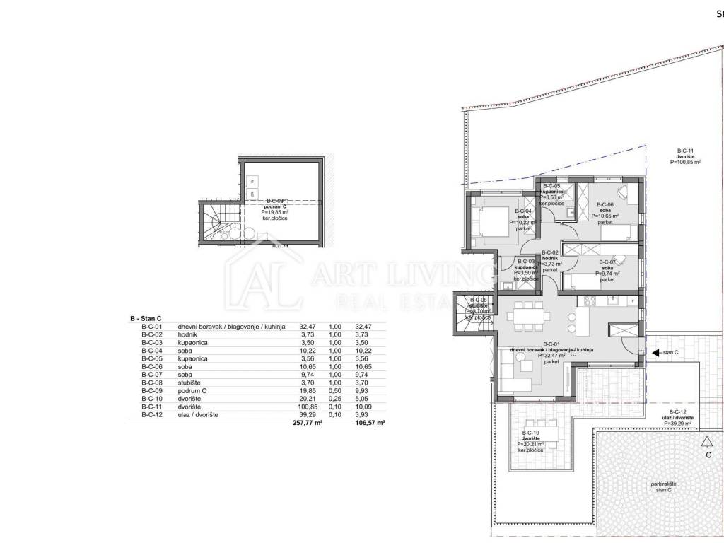 Stanu pripadaju u vlasništvo i dva parkirna mjesta kao i ostava u podrumu od 19,85 m2.