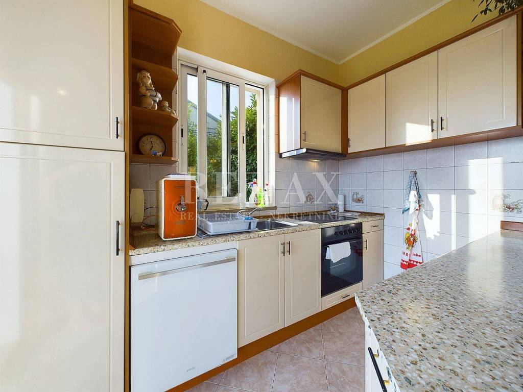 U prizemlju se nalazi veliki dnevni boravak s kuhinjom i blagovaonicom, prostrana spavaća soba, kupaonica, odvojeni WC i manja soba. Prizemlje također sadrži kotlovnicu za centralno grijanje, hodnik i ostavu. Velika terasa omogućuje ugodan boravak na otvorenom.