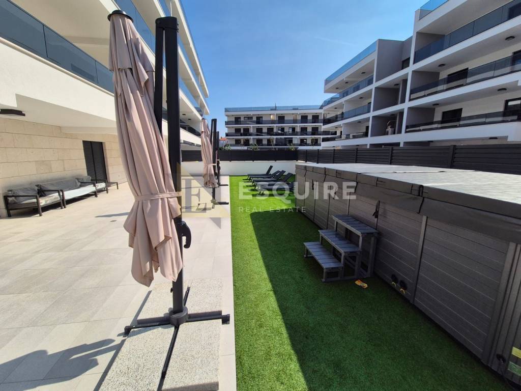 Posebna prednost stana je prostrana terasa s ljetnom kuhinjom (indukcijska ploča, sudoper, ledomat) natkrivena bioklimatskom pergolom, kao i veliki jacuzzi od 7 metara.