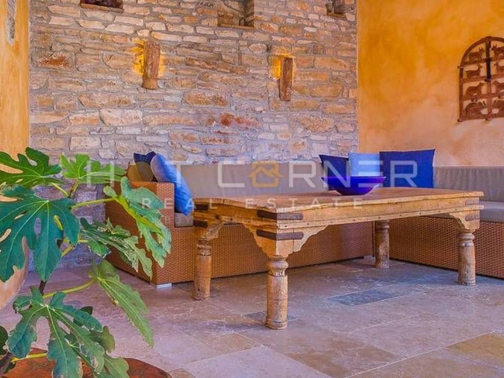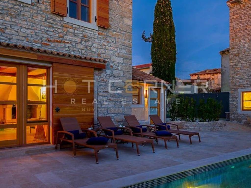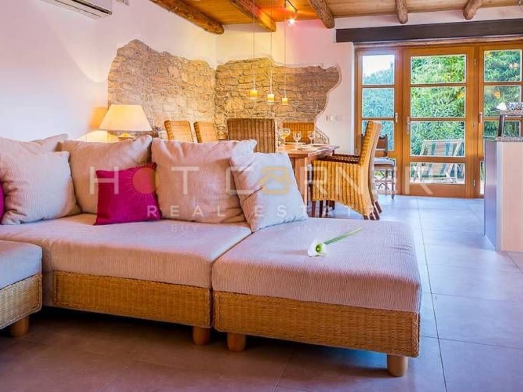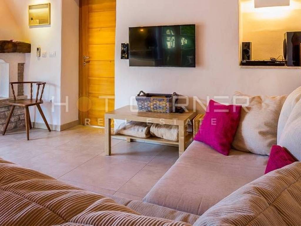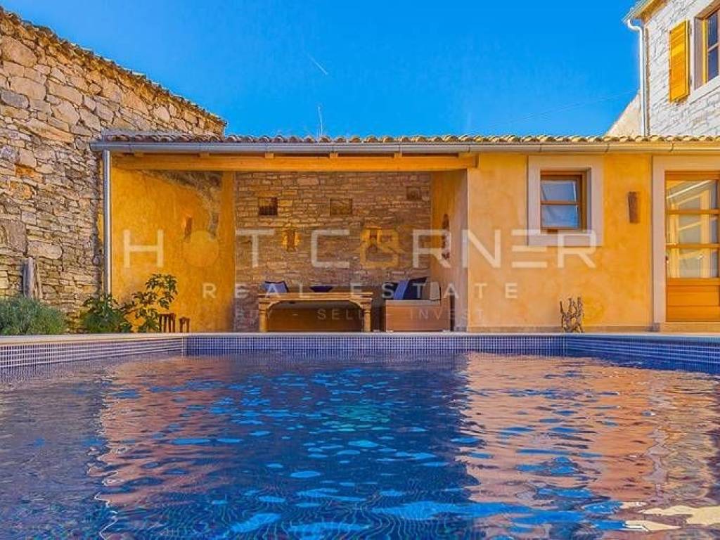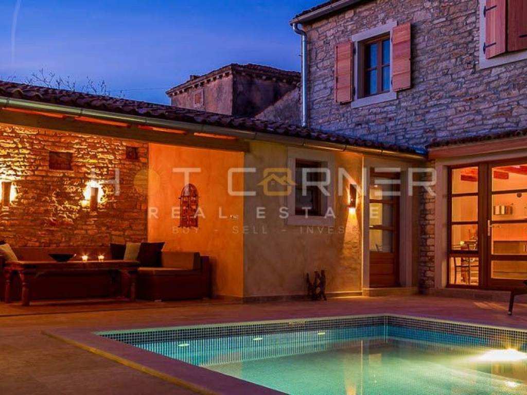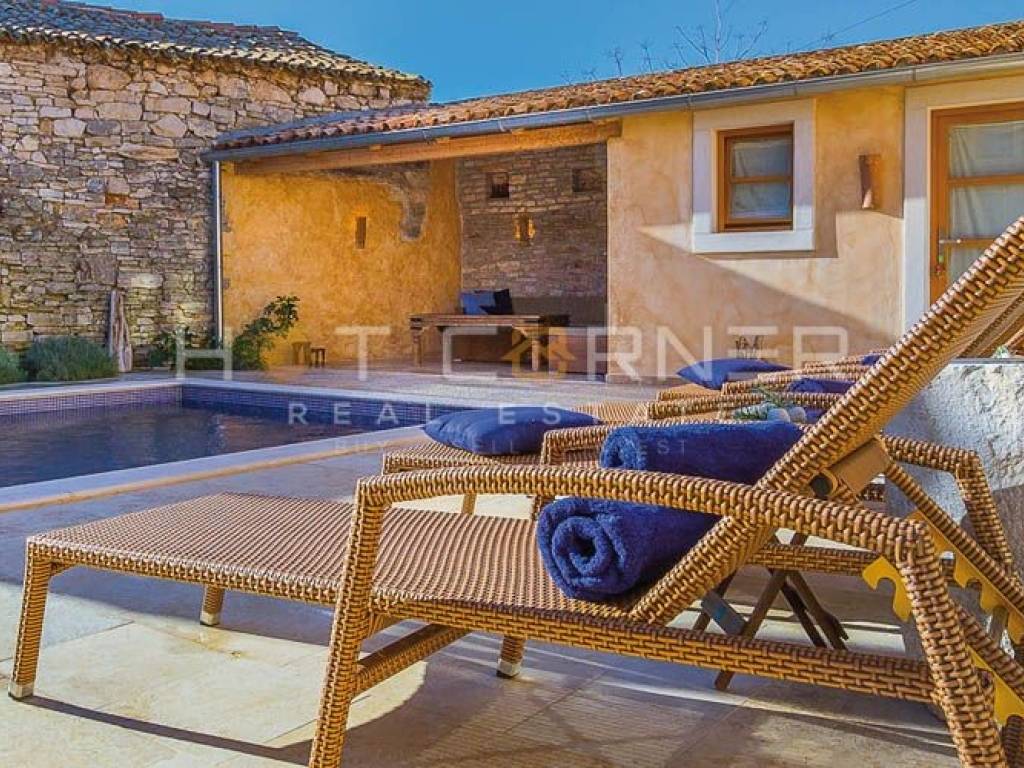 Objekt: Dvije vrhunski renovirane i šarmantno opremljene kamene kuće, svaka sa vlastitom vanjskom kuhinjom i područjem za roštiljanje i objedovanje, sa zajedničkim dvorištem u kojem se nalazi veliki grijani bazen za cjelogodišnje korištenje te sunčalište.