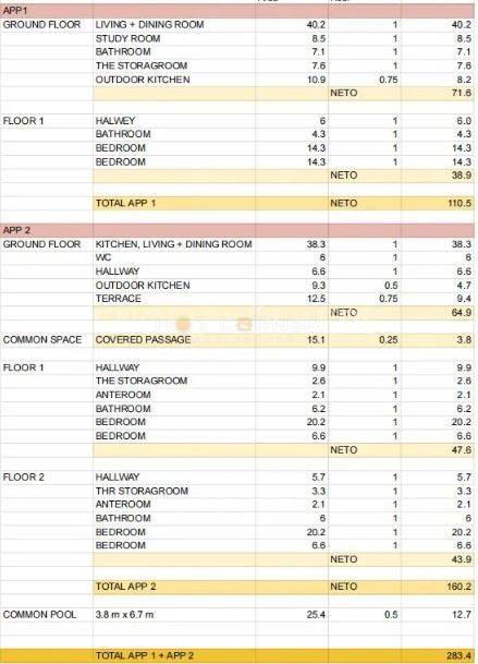 Kuća 1 – sastoji se od prizemlja i kata, ukupne površine 110,5 m2. U prizemlju kuće su smješteni prostrani dnevni boravak i kuhinja s otvorenim kaminom, i podnim grijanjem, površine 40,2 m2, radna prostorija, kupaona, spremište i vanjska kuhinja s roštiljem i prekrasnom rasvjetom, dok se na katu ove kuće nalaze dvije spavaće sobe i još jedna kupaona.