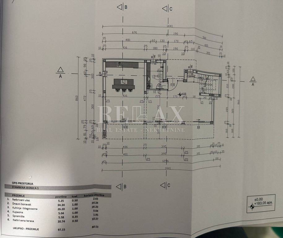 Prostire se na dvije etaže, povezane elegantnim unutarnjim stubištem. Prizemlje obuhvaća prostrani dnevni boravak s kuhinjom i blagovaonicom, otvorenog koncepta, s velikim staklenim stijenama koje omogućuju obilje prirodne svjetlosti i pružaju direktan izlaz na terasu s bazenom i sunčalištem. U prizemlju se također nalazi prostrana kupaonica, dok je ispod stubišta smješten sustav centralnog grijanja te Vaillantov bojler za podno grijanje.