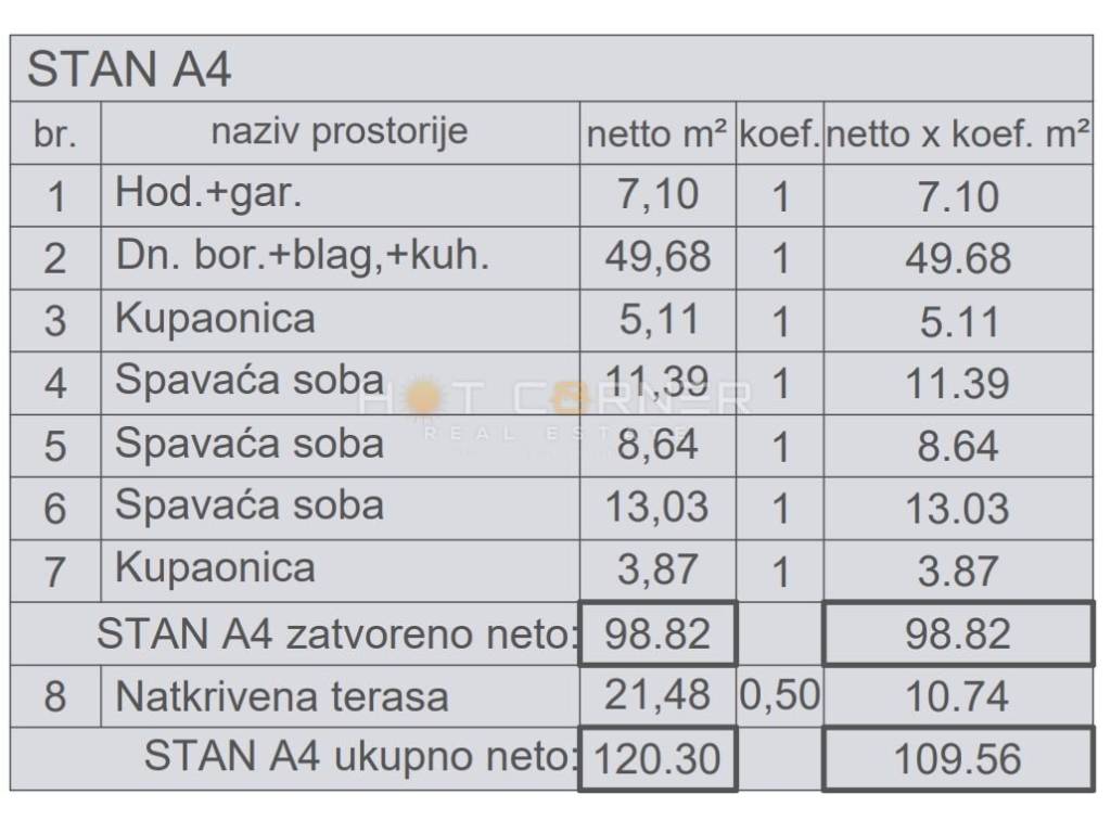 Predlažemo penthouse A4 na 2. katu s pogledom na more, koji se proteže duž cijelog 2. kata, ukupne neto korisne površine 116,15 m2, sa lijepim i funkcionalnim rasporedom: ulazni hodnik s garderobom, tri spavaće sobe, 2 kupaone, raskošni open space (DB + trpezarija + kuhinja) od čak 49 m2, iz kojeg se izlazi na prostranu terasu od 21,48 m2, s lijepim pogledom na more.