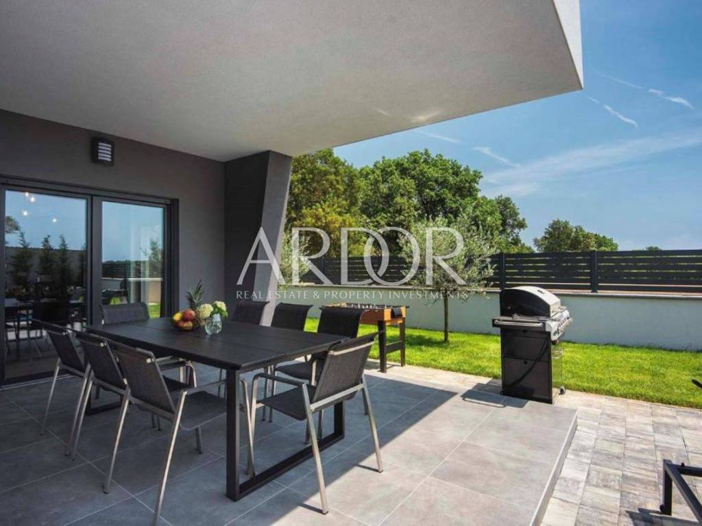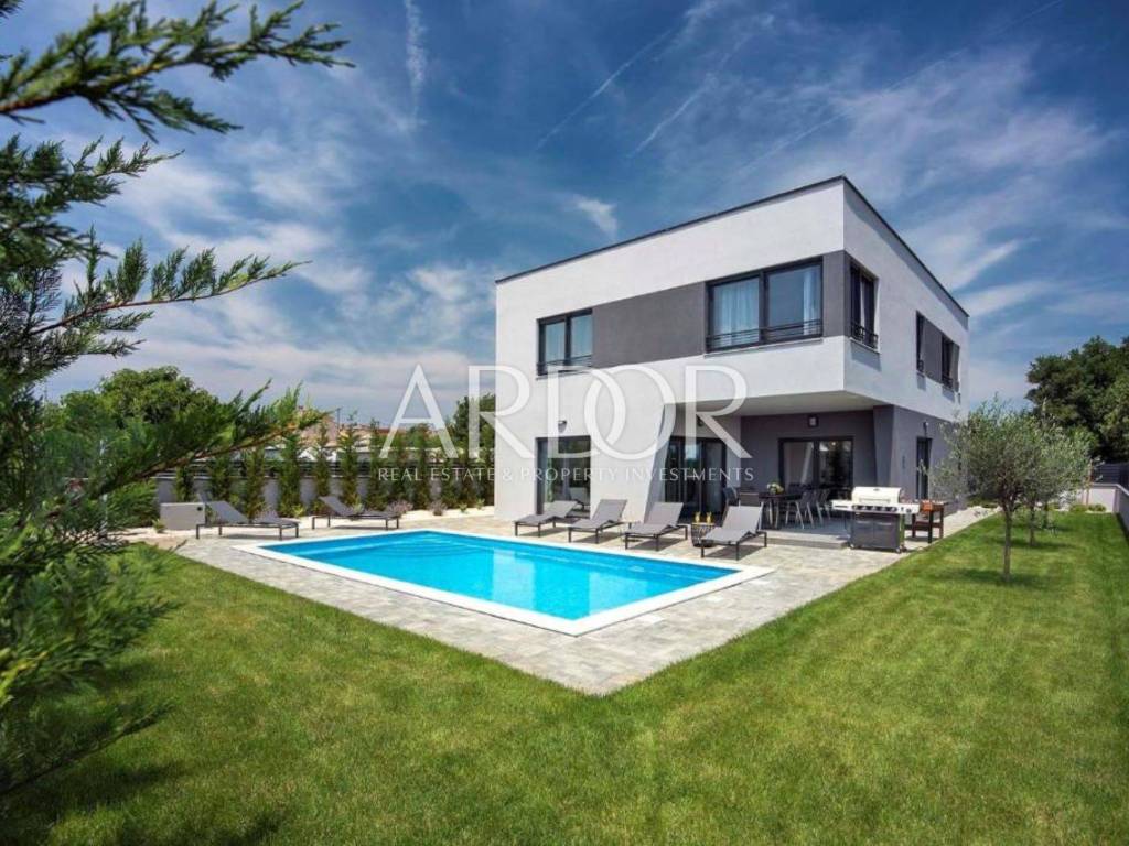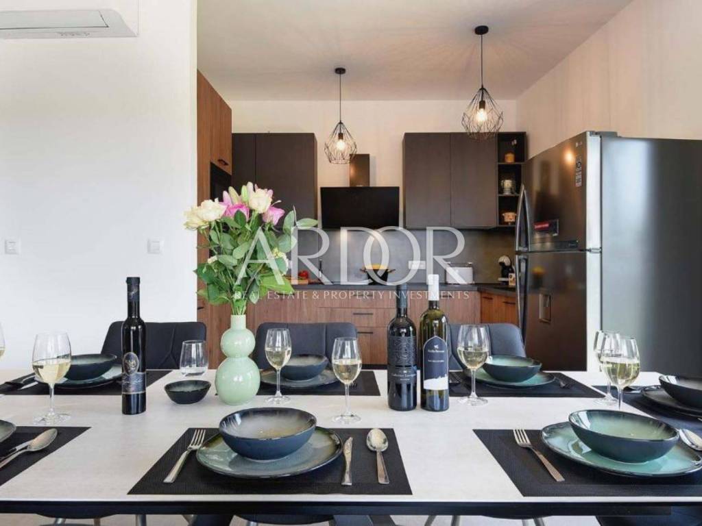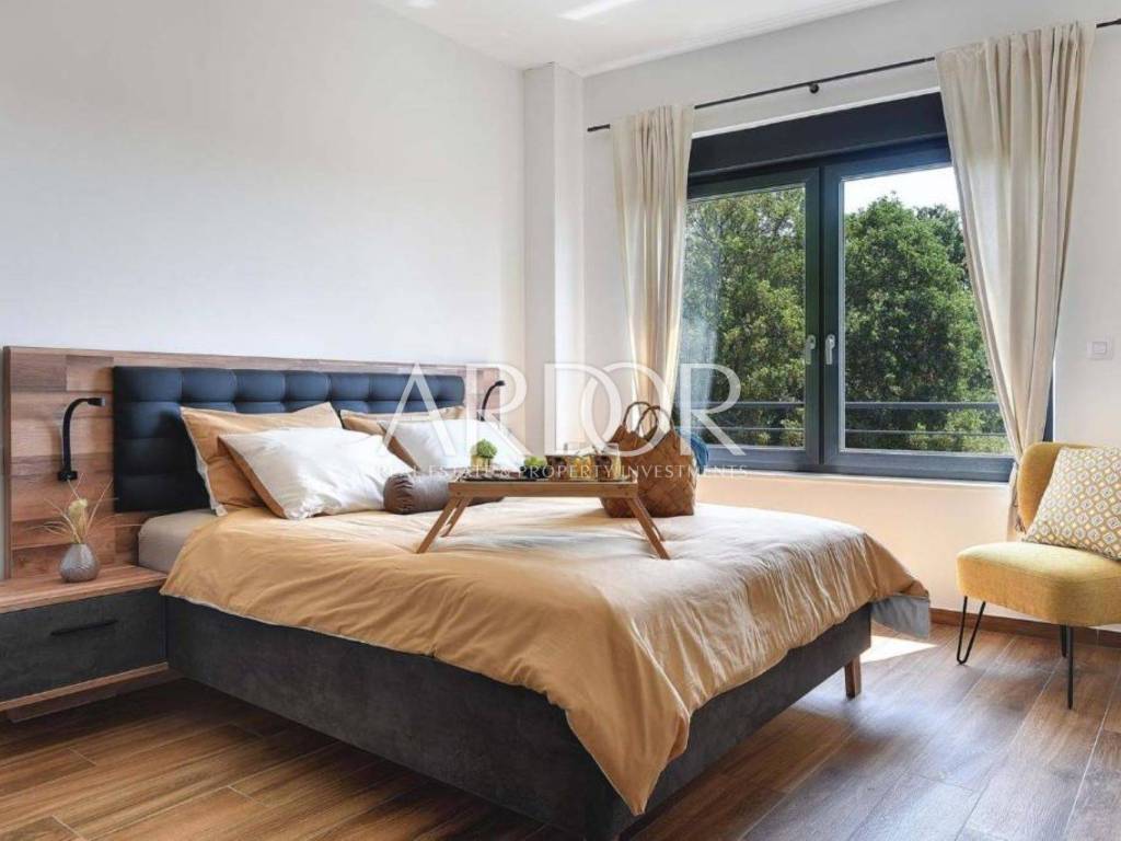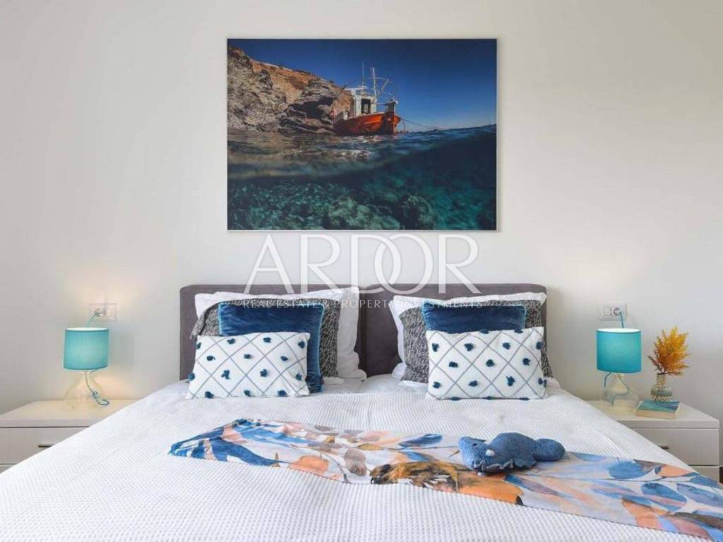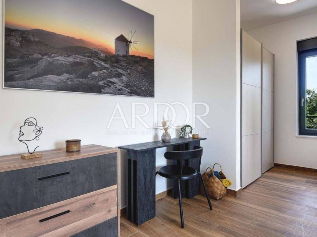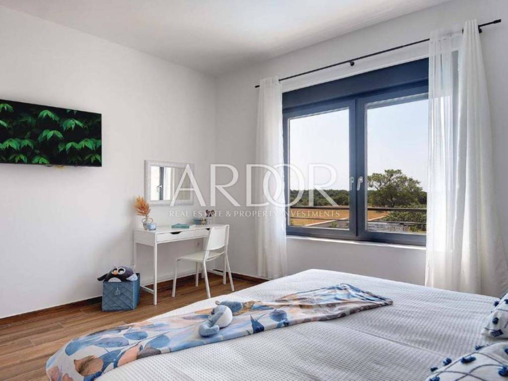 Na katu su smještene tri udobne spavaće sobe, svaka sa svojom kupaonicom, što naglašava luksuz, ali i praktičnost života u kući. Posebna vrijednost ove nekretnine leži u vrhunskoj opremi i tehnologiji: podno grijanje na toplinsku pumpu, klima uređaji s inverterom u svakoj prostoriji, te pomno odabran, moderan i luksuzan namještaj. Sve je potpuno novo, usklađeno i spremno za useljenje – bez ikakvih dodatnih ulaganja.