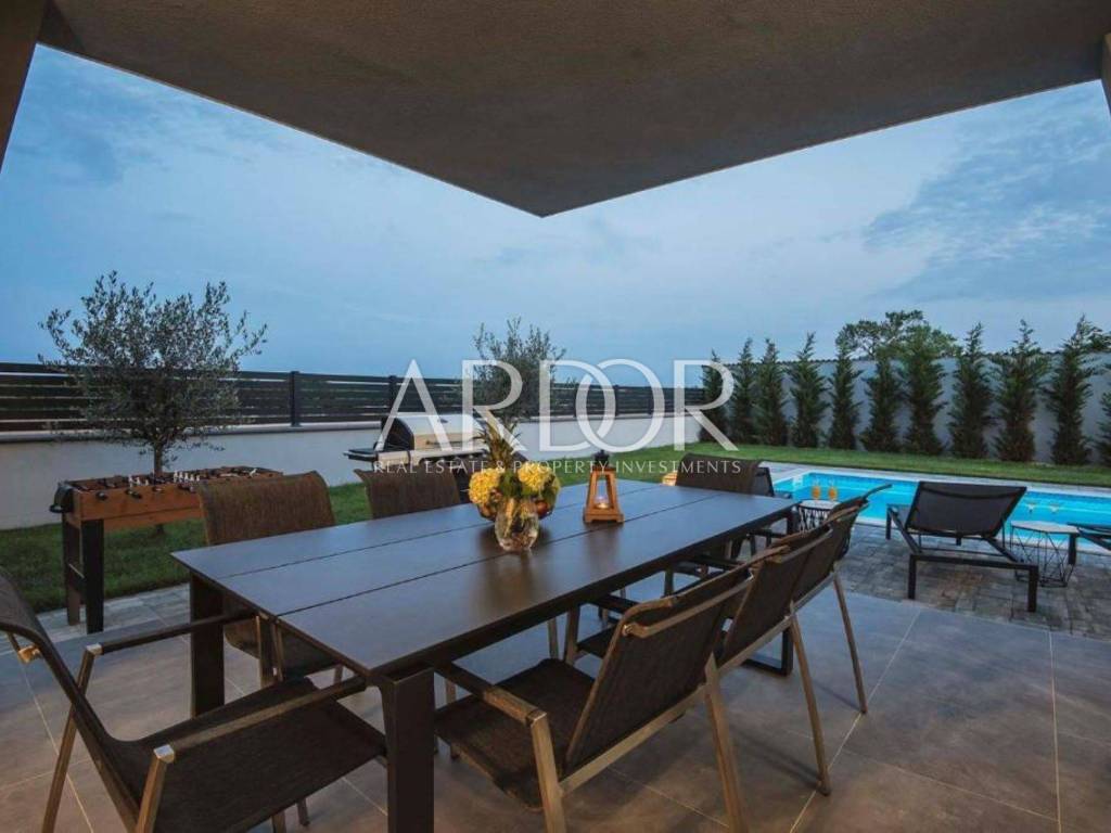 U prizemlju se nalazi prostrani open space prostor koji povezuje dnevni boravak, blagovaonicu i modernu kuhinju, uz kupaonicu i praktičnu ostavu. Iz dnevnog dijela izlazi se na veliku terasu s pogledom na grijani bazen od 32 m² i uređenu okućnicu – savršeno mjesto za obiteljska druženja, zabavu s prijateljima ili opuštanje u miru.