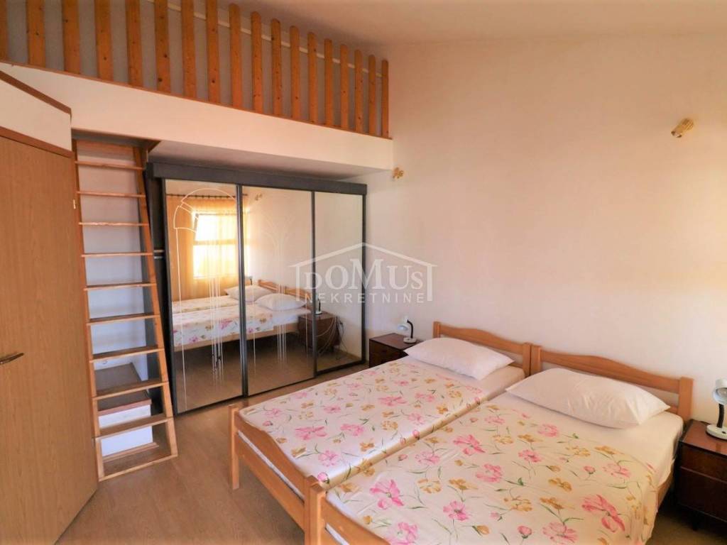 Mirna lokacija, samo 450m od Plave plaže, trosoban apartman sa galerijom sa ukupno 88,95 m2 korisne površine. Apartman zauzima cijelu etažu potkrovlja stambene zgrade, a sastoji se od kuhinje i blagovaone, tri spavaće sobe, dvije kupaone, wc-a, hodnika te galerije koja je podijeljena u tri prostorije. Apartman je namješten, klimatiziran i prodaje se sa namještajem. Apartmanu pripada 1 parkirno mjesto oznake P3. Zgrada se nalazi samo 450m od uređene Plave plaže, a od centra je udaljena 1000m.
