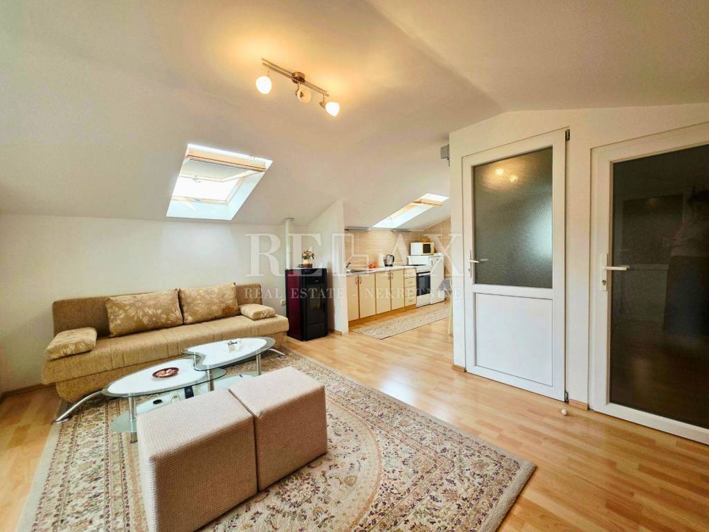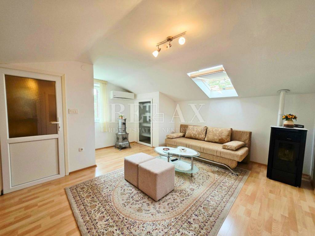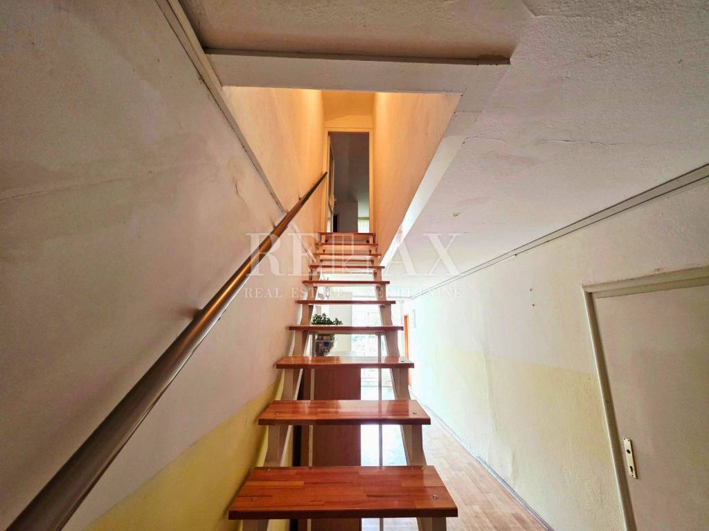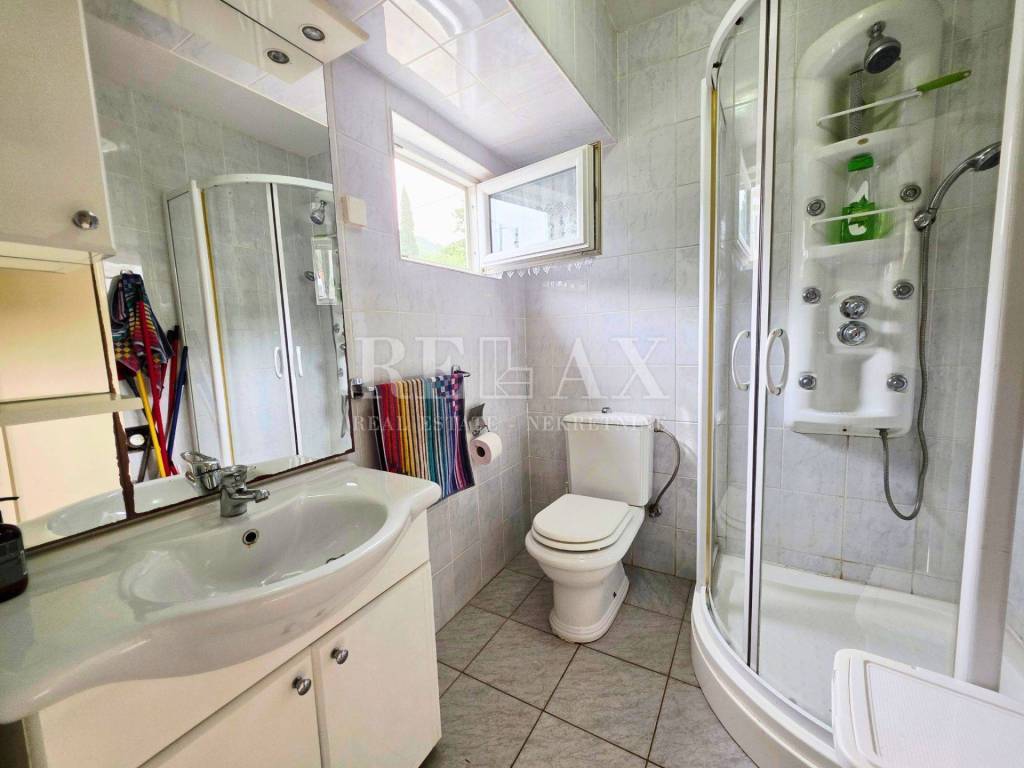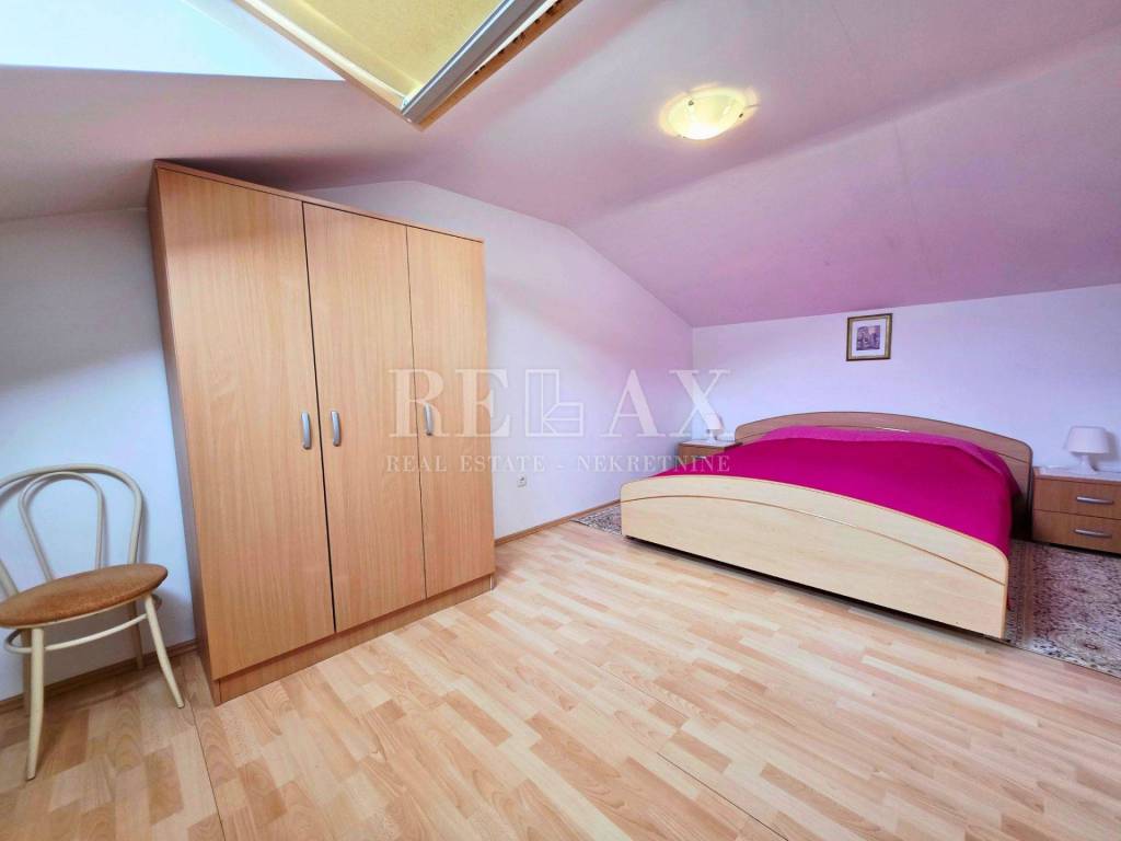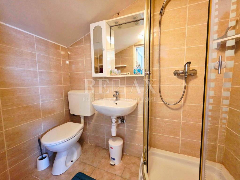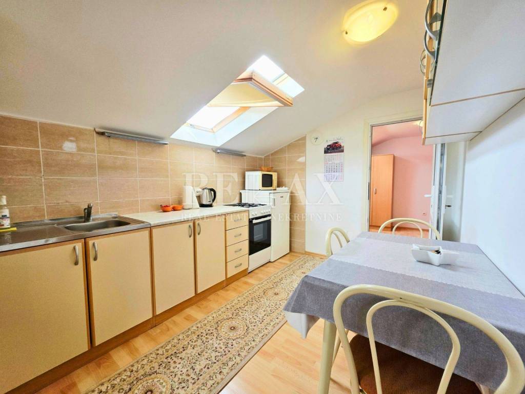 Drugi stan nalazi se u visokom potkrovlju, površine 61,20 m², do kojeg vode unutarnje stepenice iz zajedničkog hodnika zgrade. Ovaj stan obuhvaća veliki dnevni boravak s kuhinjom, spavaću sobu, kupaonicu te dva manja spremišta. Iz prostora se pruža pogled na more i okolinu, što dodatno pojačava dojam privatnosti i mira.