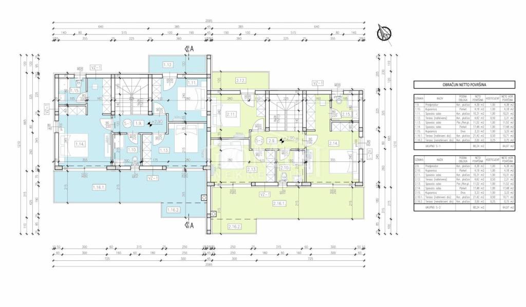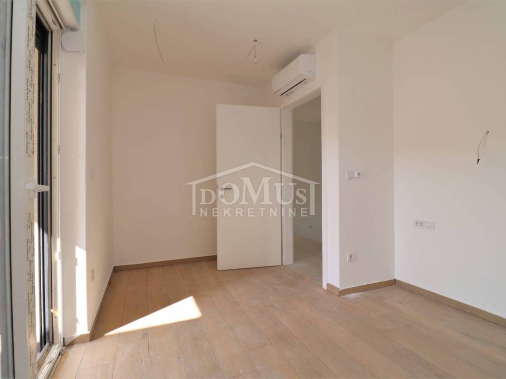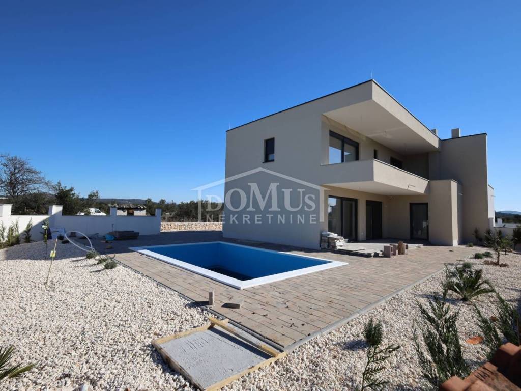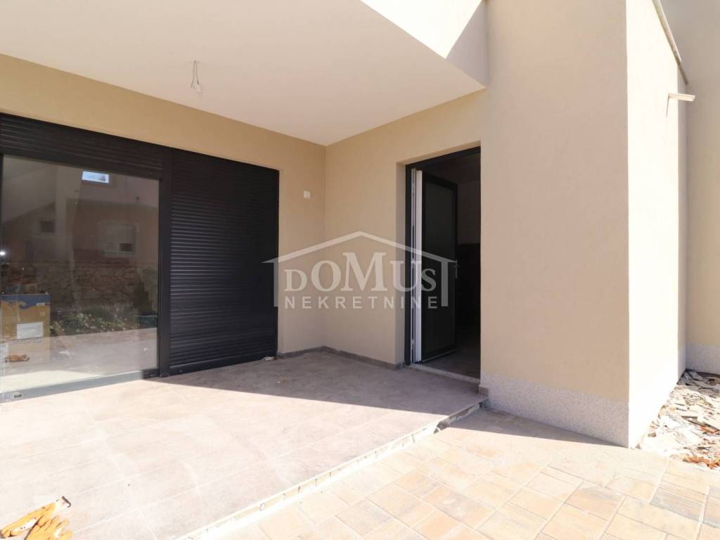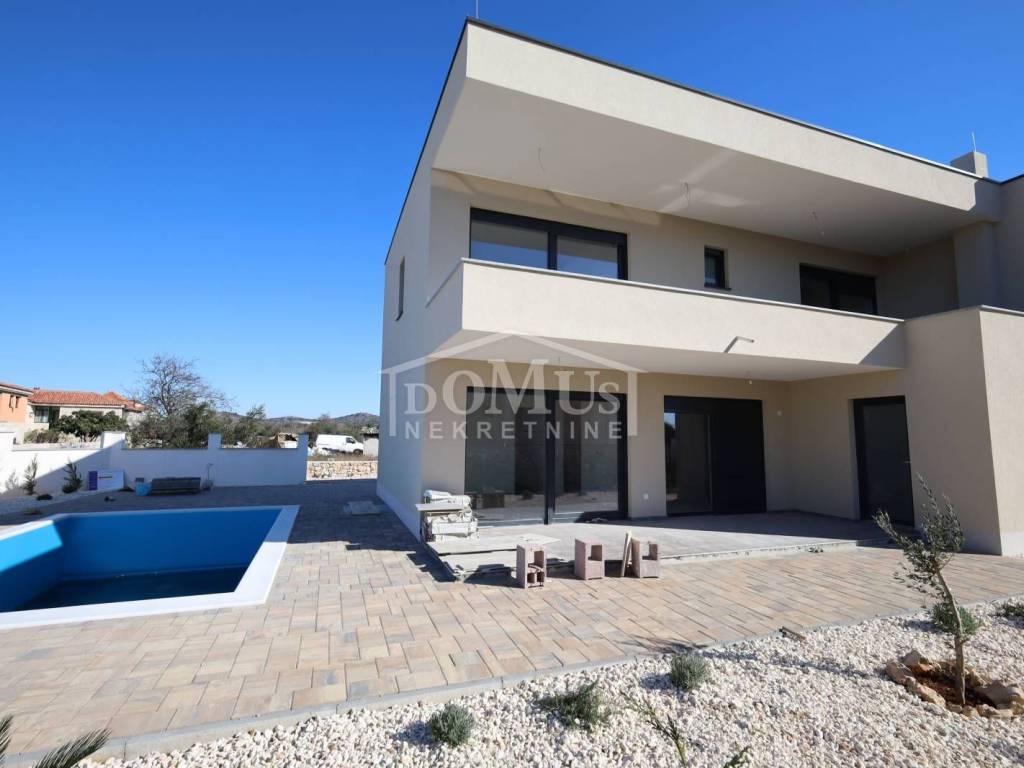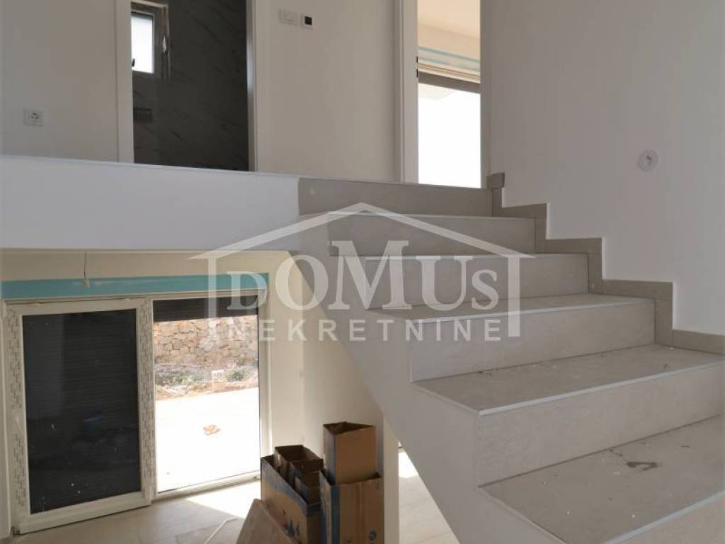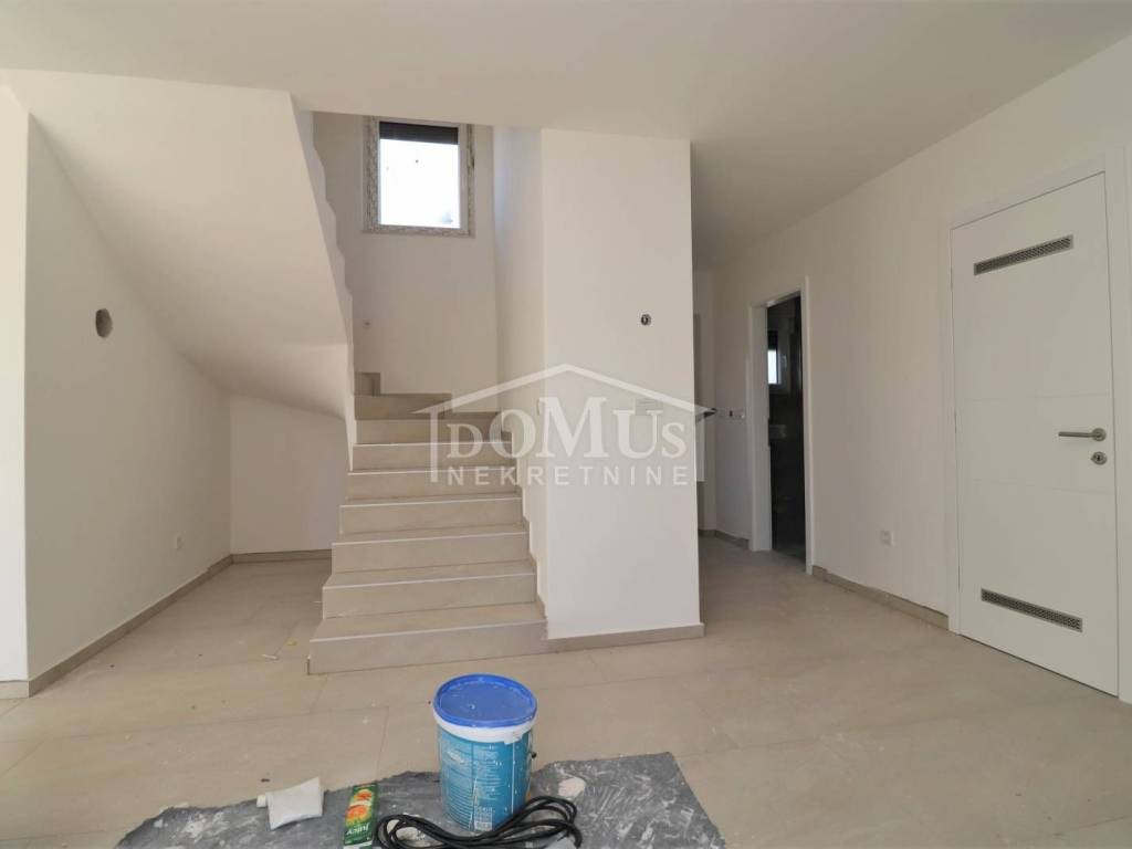 Prekrasna obiteljska kuća moderne arhitekture i vrlo funkcionalnog rasporeda u Bogdanovićima, na mirnoj lokaciji, udaljen 4,5m od šljunčane plaže na Jadriji. Kuća je dvojni objekt, (zapadna strana) na dvije etaže: Prizemlje + 1.kat sa 132,45m2 sveukupne korisne površine te 250m2 okućnice sa vanjskim bazenom od 24m2 te prostranim parkirnim prostorom. Prizemlje ima predsoblje, prostrani dnevni boravak, kuhinju i blagovaonicu, spavaća soba, spremište, kupaonicu, veliku terasu u sklopu koje je smještena ljetna kuhinja te bazen. Na 1. katu su smještene tri spavaće sobe, dvije kupaonice. Kuća se gradi modernim i kvalitetnim materijalima kao što je: termo fasada 10 cm, stolarija antracit boje sa električnim podizačima roleta i komarnicima, u kupaonicama moderna sanitarija, podno grijanje na struju u svim kupaonicama u prizemlju i na katu, sve spavaće sobe i dnevni boravak su opremljeni sa klima uređajima.