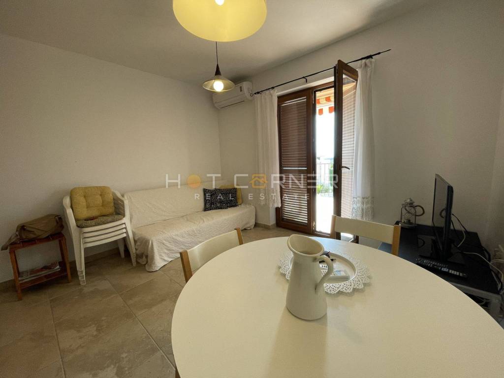 Stan se sastoji od ulaznog hodnika koji vodi prema svim prostorijama, prostrane kuhinje s blagovaonicom koja ima izlaz na veliku terasu sa pogledom na more – idealnu za uživanje na otvorenom tijekom sunčanih dana, modernog kupatila s podnim grijanjem i tuš kabinom, te jedne udobne spavaće sobe. Uz stan dolazi i jedno natkriveno parkirno mjesto, što predstavlja dodatnu pogodnost za vlasnike vozila. Stan ima vanjsku PVC stolariju sa škurama, inverterski klima uređaj, protuprovalna ulazna vrata.