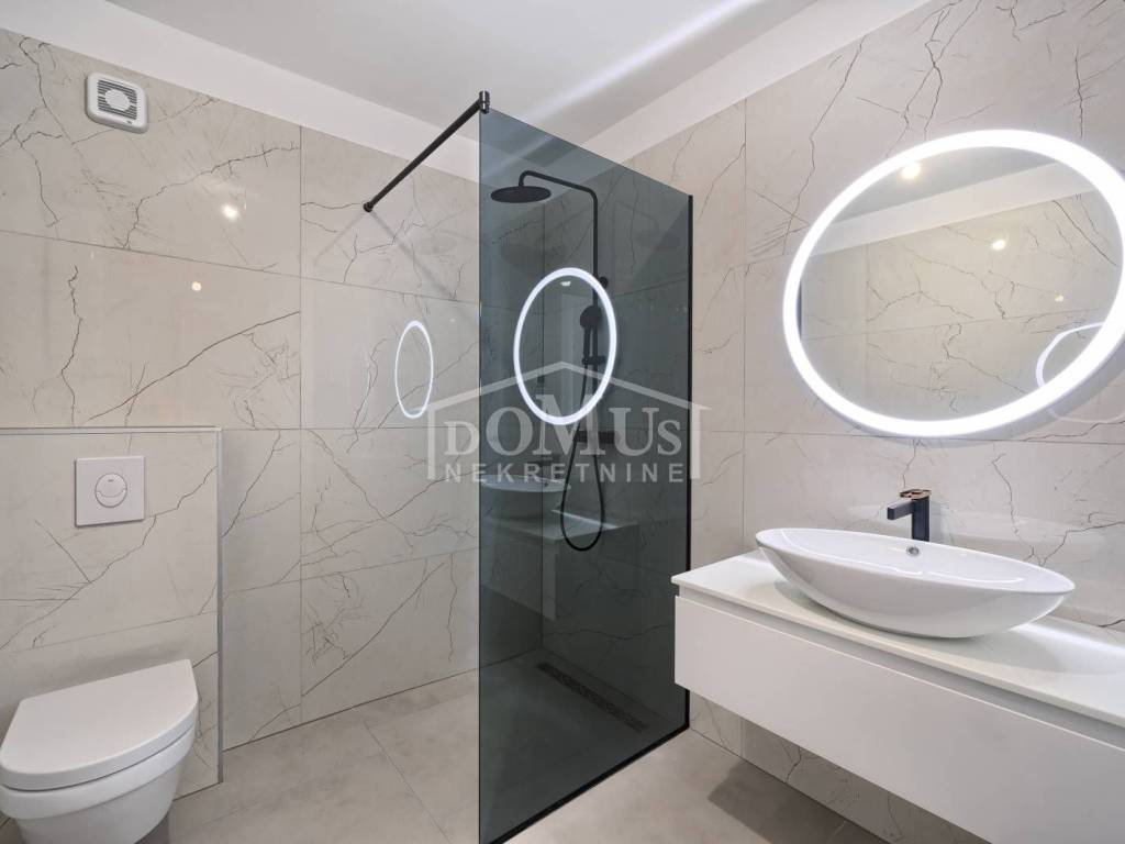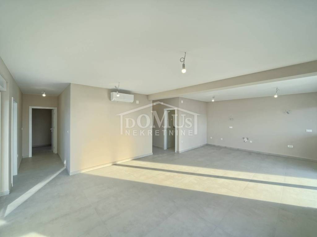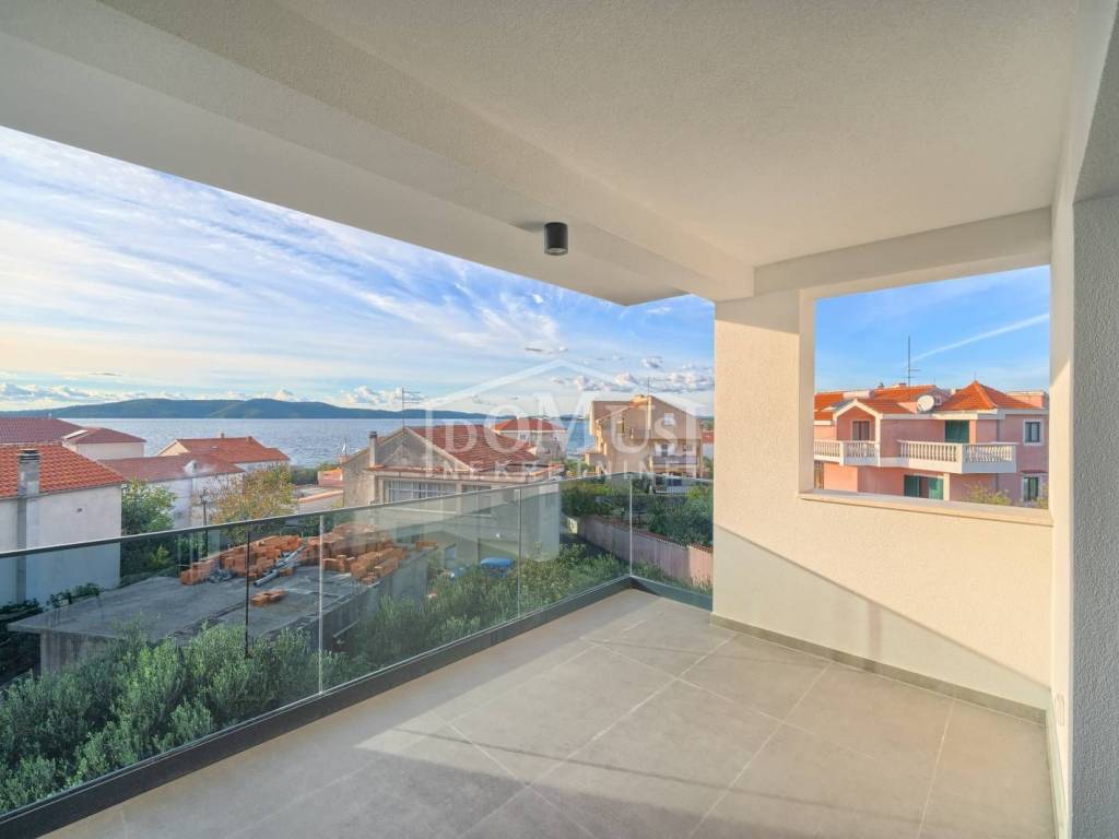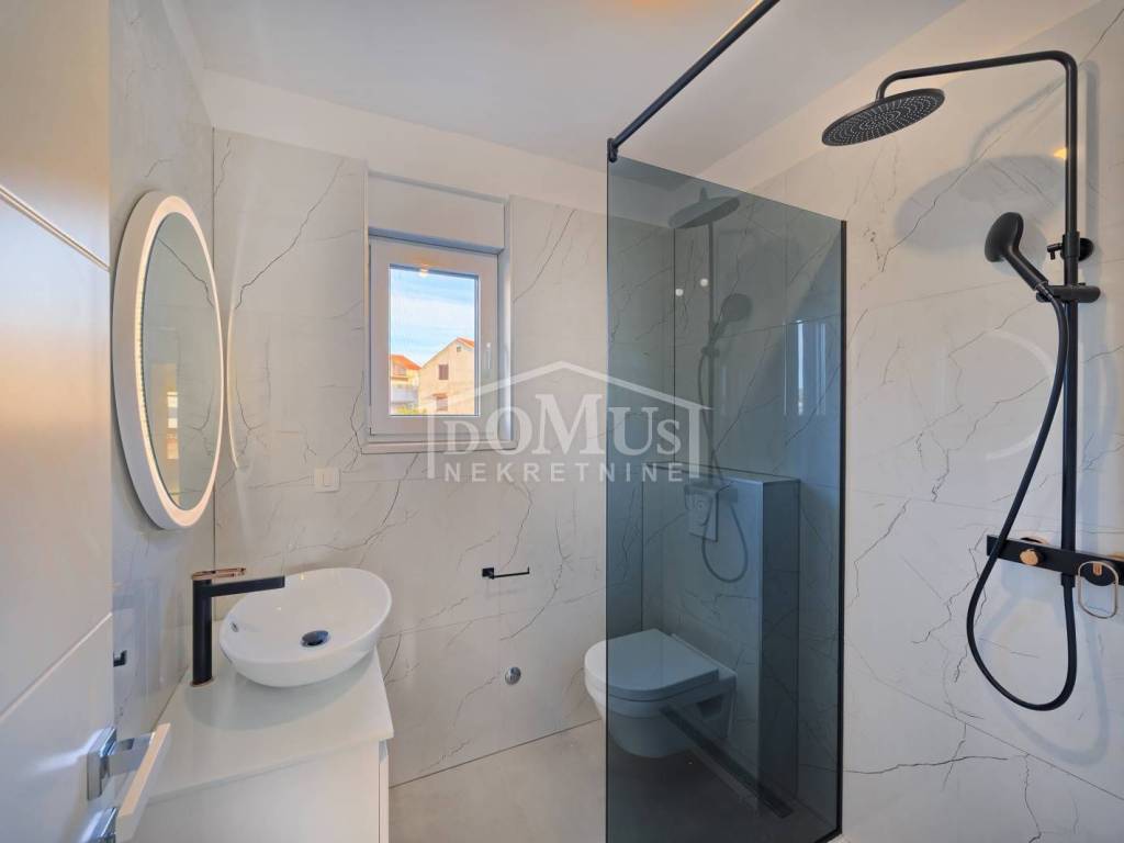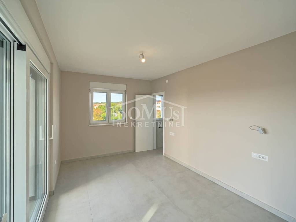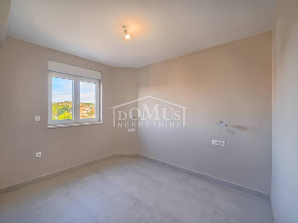 Brodarica, novogradnja, 150m od mora, četverosobni apartman sa ukupno 113,24m2 ukupne površine. Isti se nalazi na 2.katu stambene zgrade koja ima ukupno tri etaže sa ukupno 5 stambenih jedinica, a orijentiran je na jugo-zapadnu stranu. Apartman površine 110,84m2 se sastoji od hodnika, predsoblja, kuhinje, blagovaone i dnevnog boravka u cjelini, dvije terasa od 10,19m2 i 11,11m2 sa prekrasnim pogledom na more, 4 spavaće sobe, 3 kupaonice i wc-a. Apartmanu pripadaju dva parkirna mjesta. Apartman nije namješten, građen je od visoko kvalitetnih materijala, klima uređaj u dnevnom boravku, podno grijanje u kupaonici, električni podizači roleta, komarnici, portafon. Kupac je oslobođen plaćanja poreza na promet nekretnina.