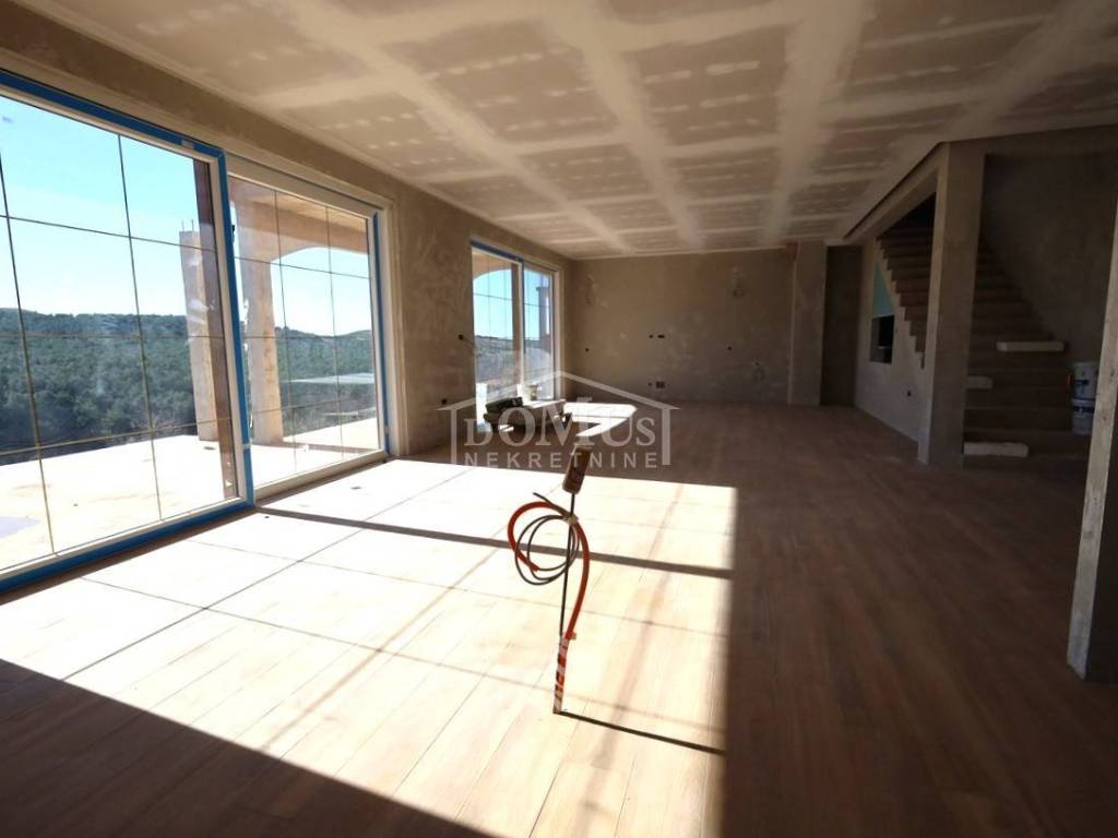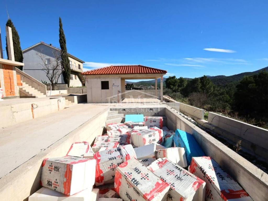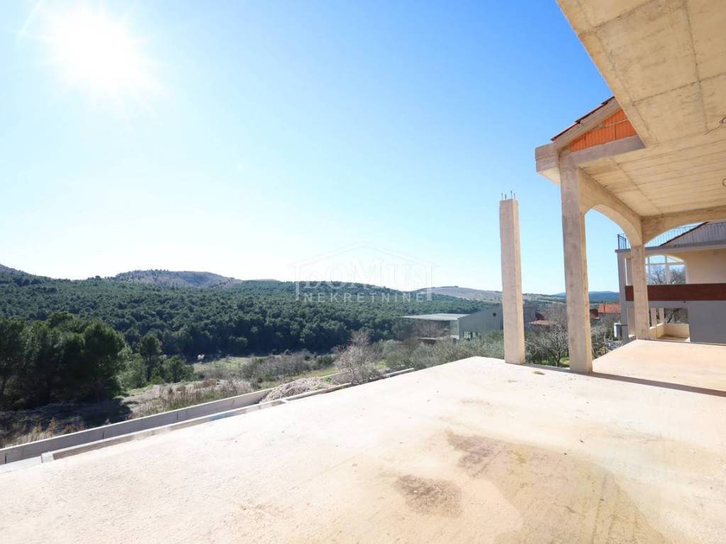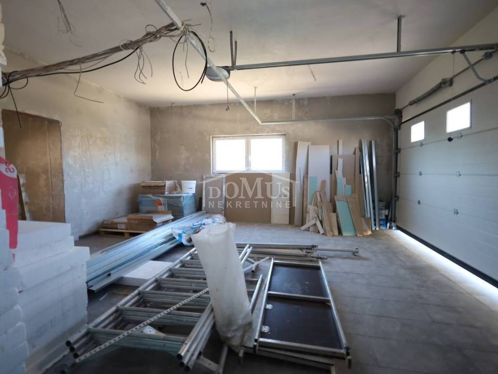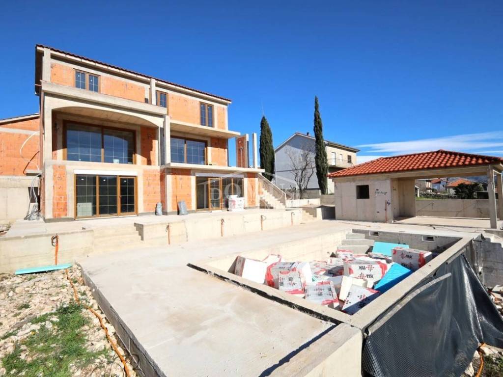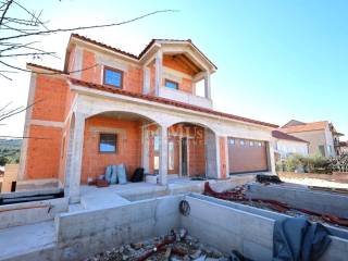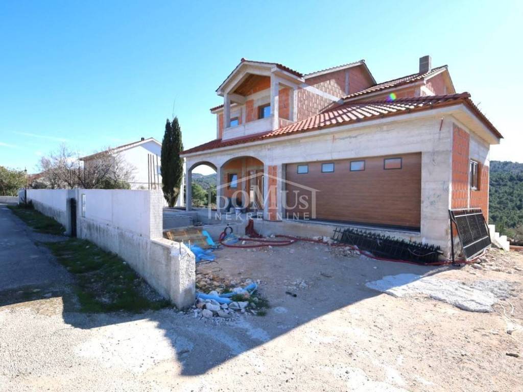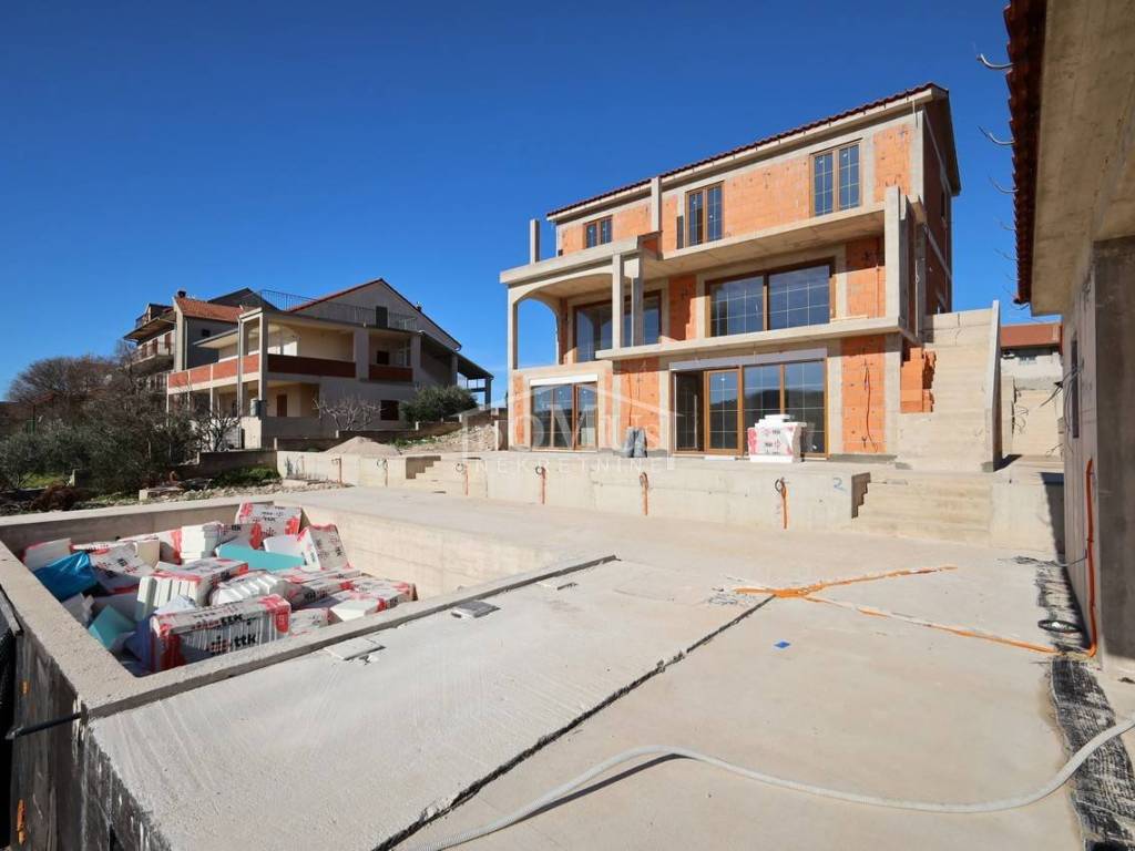 Novogradnja, komforna obiteljska kuća ukupne korisne površine 375,95m2 sa garažom i pomoćnim objektom u dvorištu i bazenom površine 32m2. U suterenu kuće se nalazi hodnik i stepenište, ostava, spremište i konoba (prostor za druženje), a poseban ulaz za kuhinju sa blagovaonom, hodnik, kupaonicu, dvije spavaće sobe, te vanjsko spremište. U prizemlju se nalazi glavni ulaz u kuću, gdje je smještena garaža 37,50m2 sa ostavom i spremištem, stepenište, wc, ostava, veliki dnevni boravak sa kuhinjom i blagovaonom sa izlazom na veliku terasu 45, 25m2. Unutarnje stepenice vode na 1. kat gdje se nalazi hodnik, 3 spavaće sobe, svaka sa svojom garderobom i izlazom na terasu dok jedna soba ima i svoju kupaonu, zasebna kupaona i praonica. Parcela je površine 1.193m2, dvorište je kompletno ograđeno, te ima kaskadne vrtove, bazen i pomoćni objekt 7,8m2 i natkrivene terase 22,82 m2. Kuća je u visokom roh bau, izvršena priprema podnog grijanja na dizalicu topline i klimatizaciju te istoj nedostaje unutarnja stolarija, bojanje, i sanitarije. Cijena se odnosi na ovaj stupanj izgrađenosti, a za kompletno završen objekt (uključujući i fasadu) i ishodovane uporabne dozvole, cijena po dogovoru. Do mora 4,4 km, a do Šibenika 11 km.
