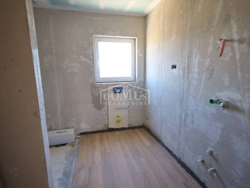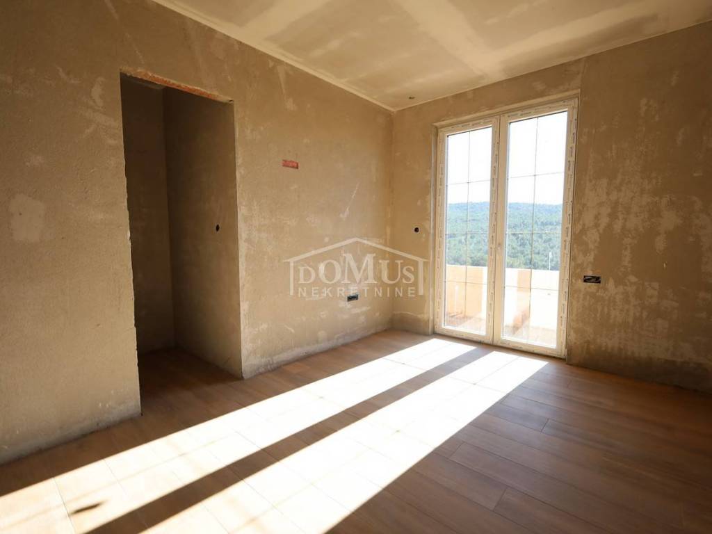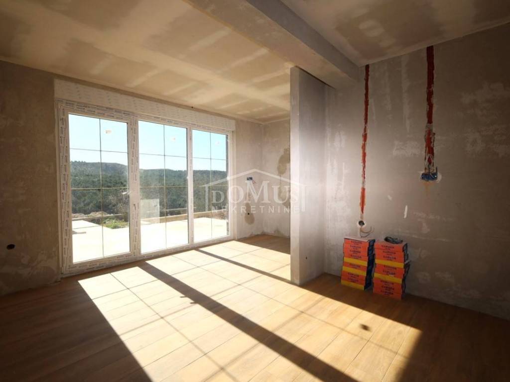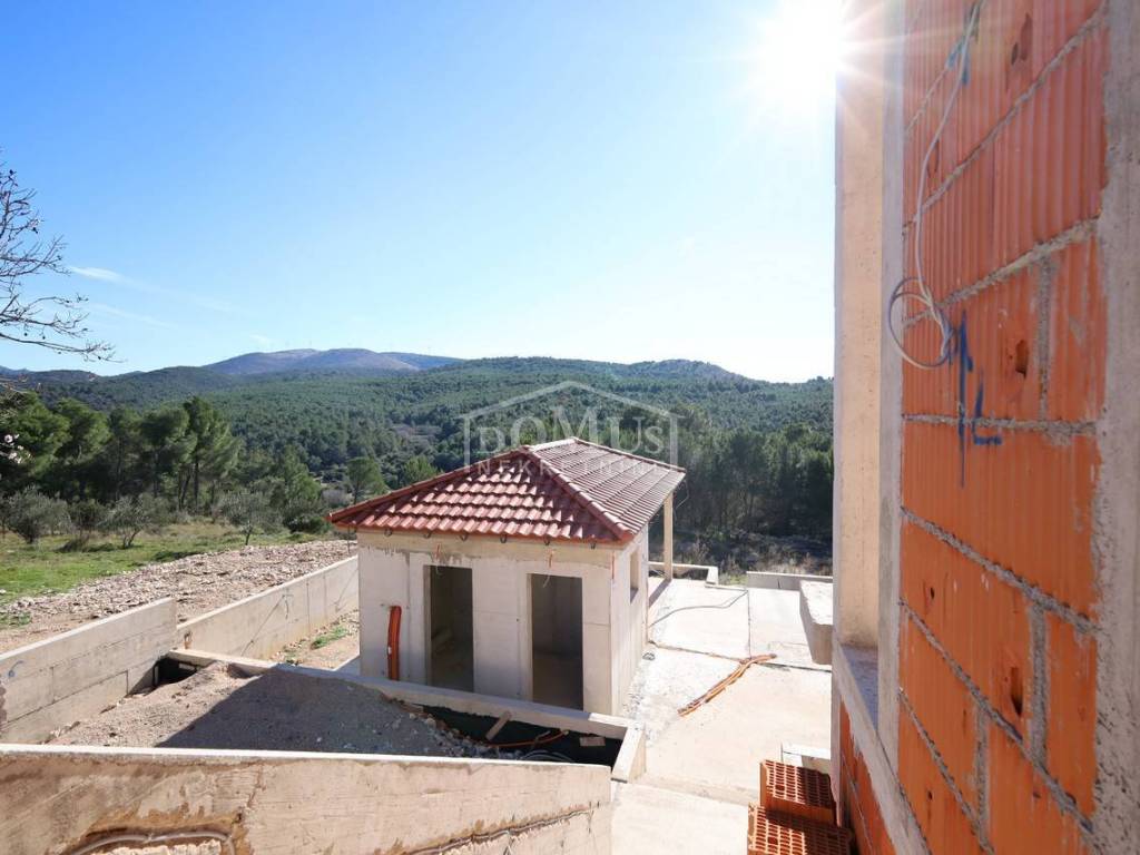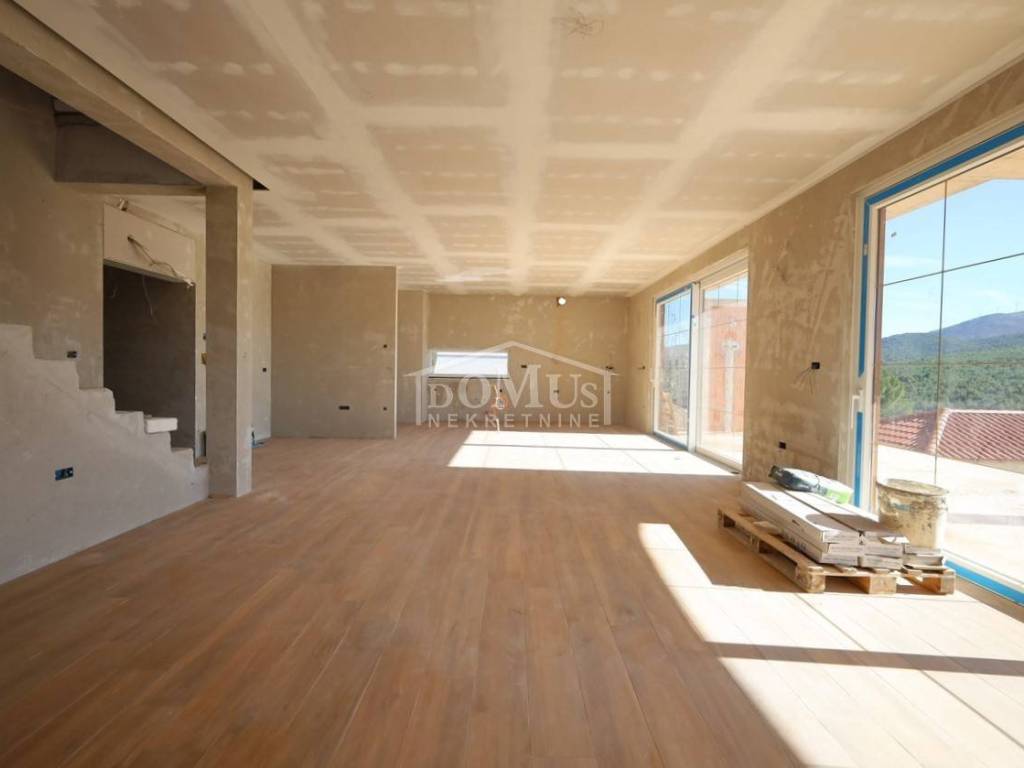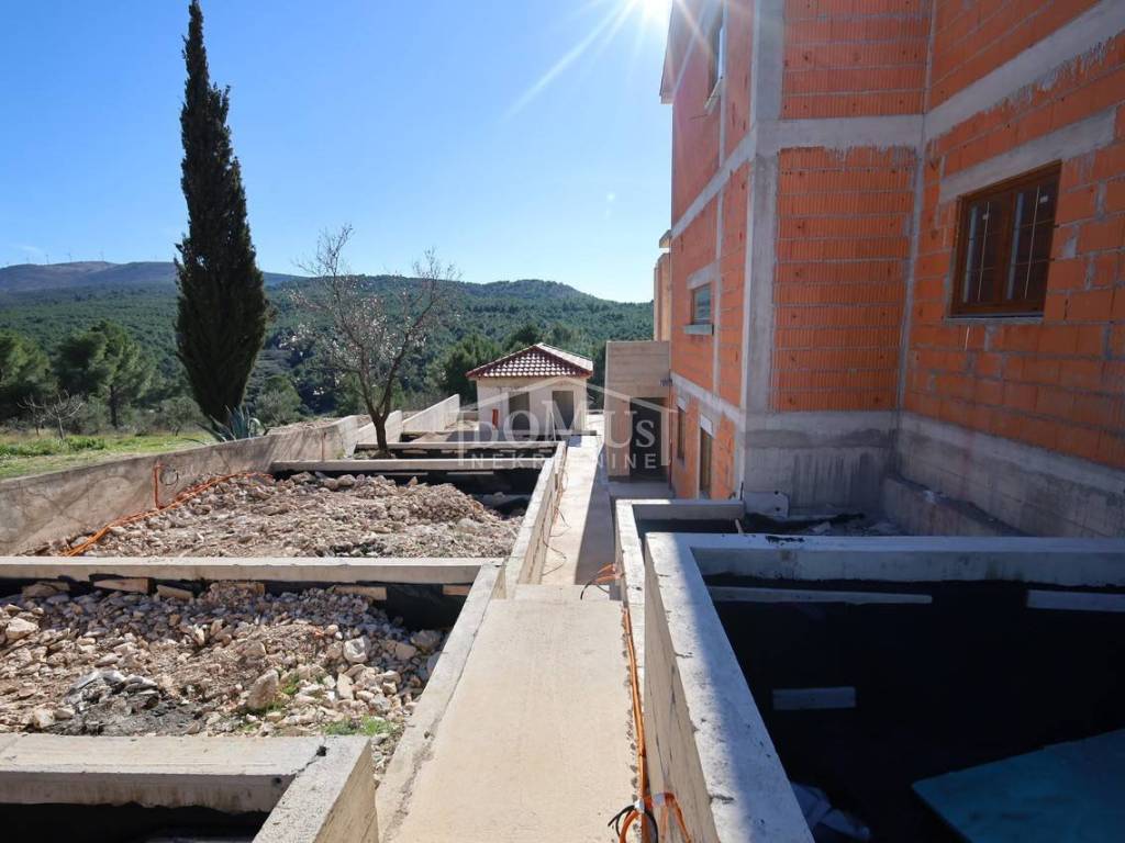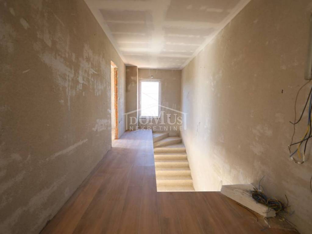 Novogradnja, komforna obiteljska kuća ukupne korisne površine 375,95m2 sa garažom i pomoćnim objektom u dvorištu i bazenom površine 32m2. U suterenu kuće se nalazi hodnik i stepenište, ostava, spremište i konoba (prostor za druženje), a poseban ulaz za kuhinju sa blagovaonom, hodnik, kupaonicu, dvije spavaće sobe, te vanjsko spremište. U prizemlju se nalazi glavni ulaz u kuću, gdje je smještena garaža 37,50m2 sa ostavom i spremištem, stepenište, wc, ostava, veliki dnevni boravak sa kuhinjom i blagovaonom sa izlazom na veliku terasu 45, 25m2. Unutarnje stepenice vode na 1. kat gdje se nalazi hodnik, 3 spavaće sobe, svaka sa svojom garderobom i izlazom na terasu dok jedna soba ima i svoju kupaonu, zasebna kupaona i praonica. Parcela je površine 1.193m2, dvorište je kompletno ograđeno, te ima kaskadne vrtove, bazen i pomoćni objekt 7,8m2 i natkrivene terase 22,82 m2. Kuća je u visokom roh bau, izvršena priprema podnog grijanja na dizalicu topline i klimatizaciju te istoj nedostaje unutarnja stolarija, bojanje, i sanitarije. Cijena se odnosi na ovaj stupanj izgrađenosti, a za kompletno završen objekt (uključujući i fasadu) i ishodovane uporabne dozvole, cijena po dogovoru. Do mora 4,4 km, a do Šibenika 11 km.