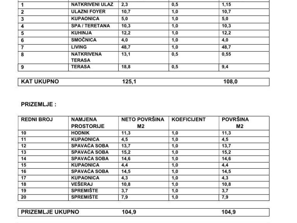 Prizemlje vile sastoji se od 4 spavaće sobe, tri kupaonice, igraonice, spremišta; sve sobe imaju izlaz na terasu s sunčalištem u sklopu kojeg se nalazi bazen od 25 m² te lijepo uređeni vrt i okućnica.