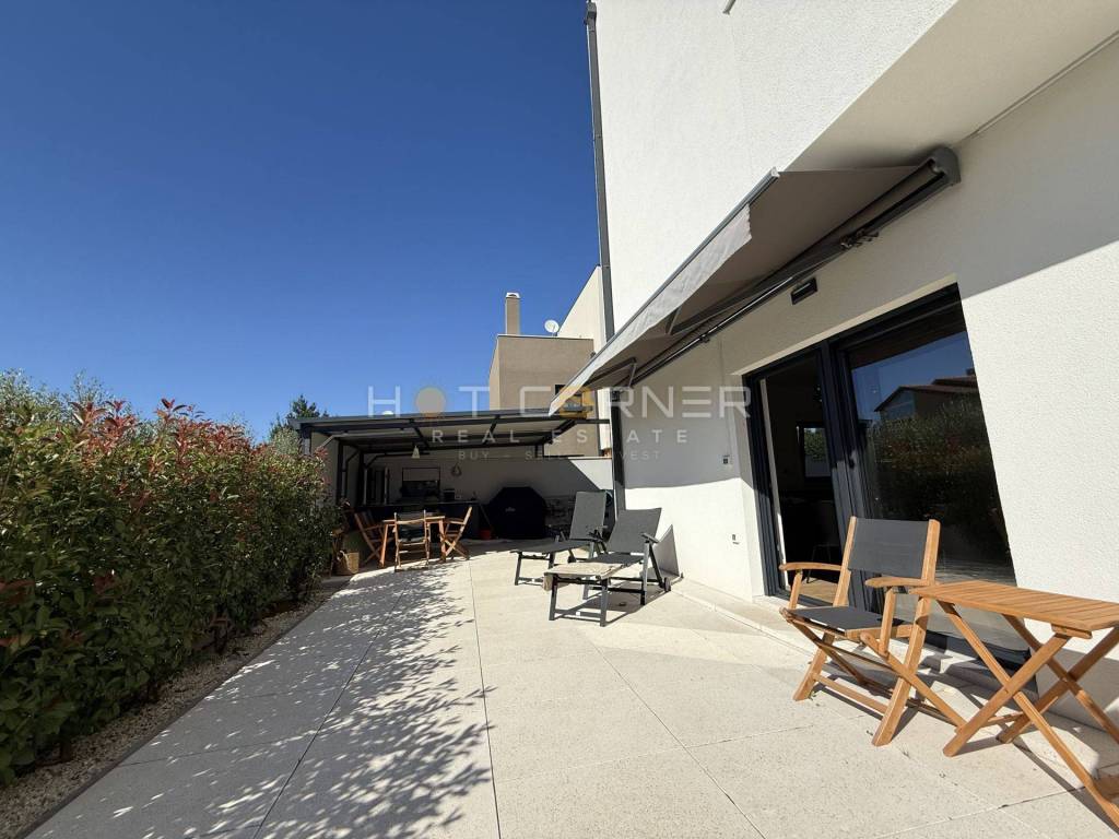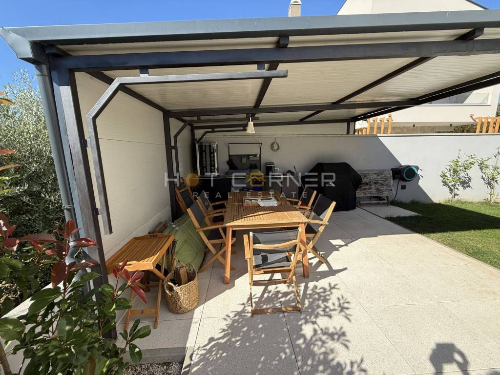 - Okućnica (terasa + vrt) od 231,07 m2, sa velikom nenatkrivenom terasom površine 96,90 m2 i bazen površine 38,23 m2, okrenuti prema jugu i zapadu te time osvjetljeni i osunčani veći dio dana, sa noćnom rasvjetom, i „živom“ ogradom od biljaka, čime se dobiva relaksirajući pogled na zelenilo prilikom boravka na terasi uz bazen