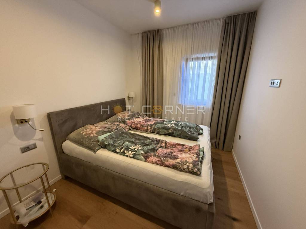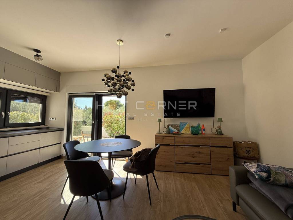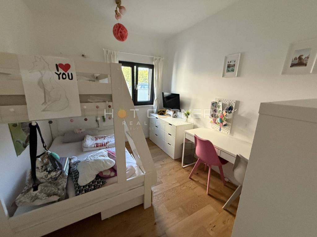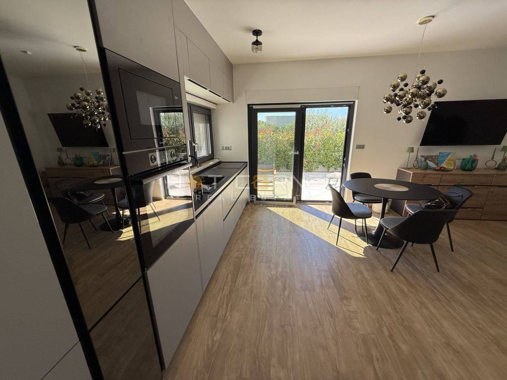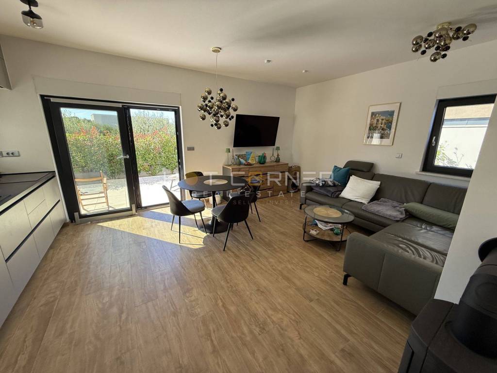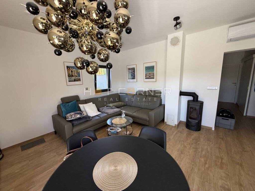- Sam stan ima unutarnju površinu 53,28 m2, s ulaznim hodnikom, kupaonom, dvije spavaće sobe, malim unutarnjim spremištem, velikim open space dnevnim boravkom s kuhinjom i trpezarijom s prekrasnim pogledom na bazen i zelenilo. OPREMA STANA: kompletno kvalitetno i moderno namješten stan, 3 klima uređaja s mogućnošću aktivacije na daljinu putem WiFI-a, električno podno grijanje u kupaoni, peć na drva u DB, kuhinja s uređajima (perilica suđa s WiFI funkcijom)