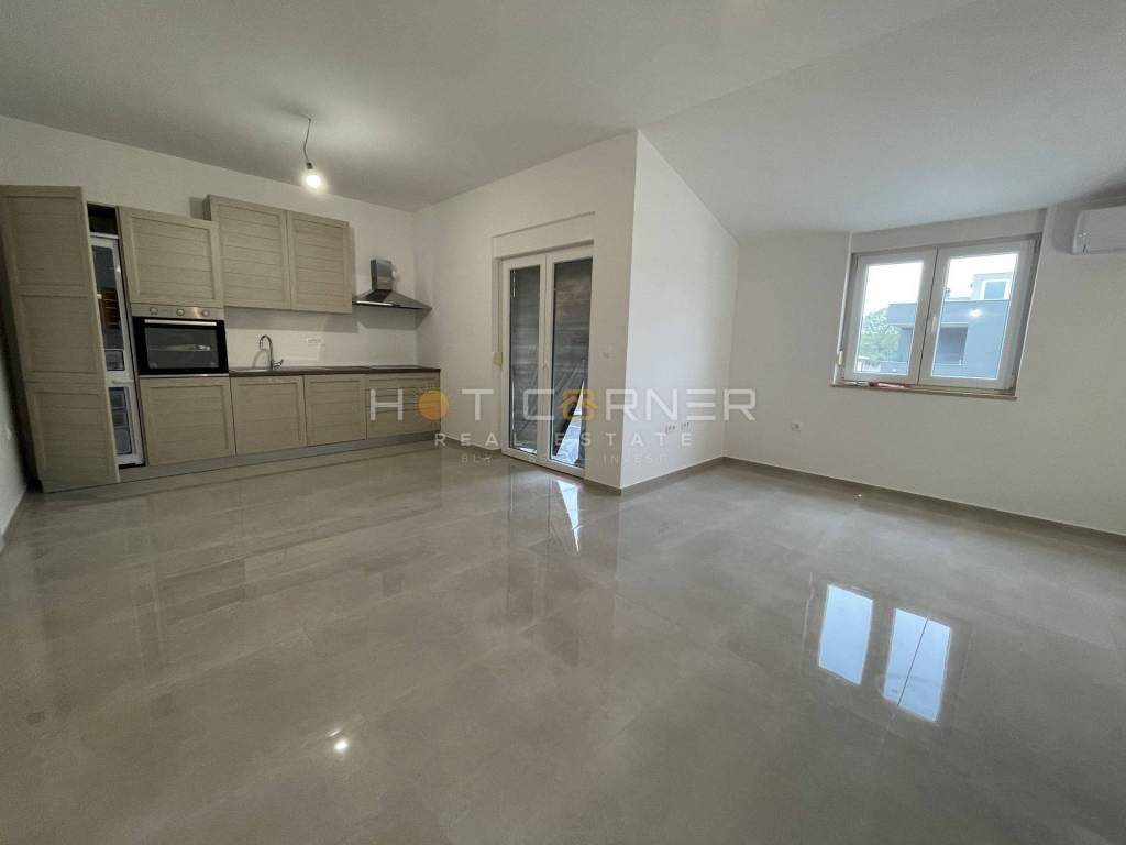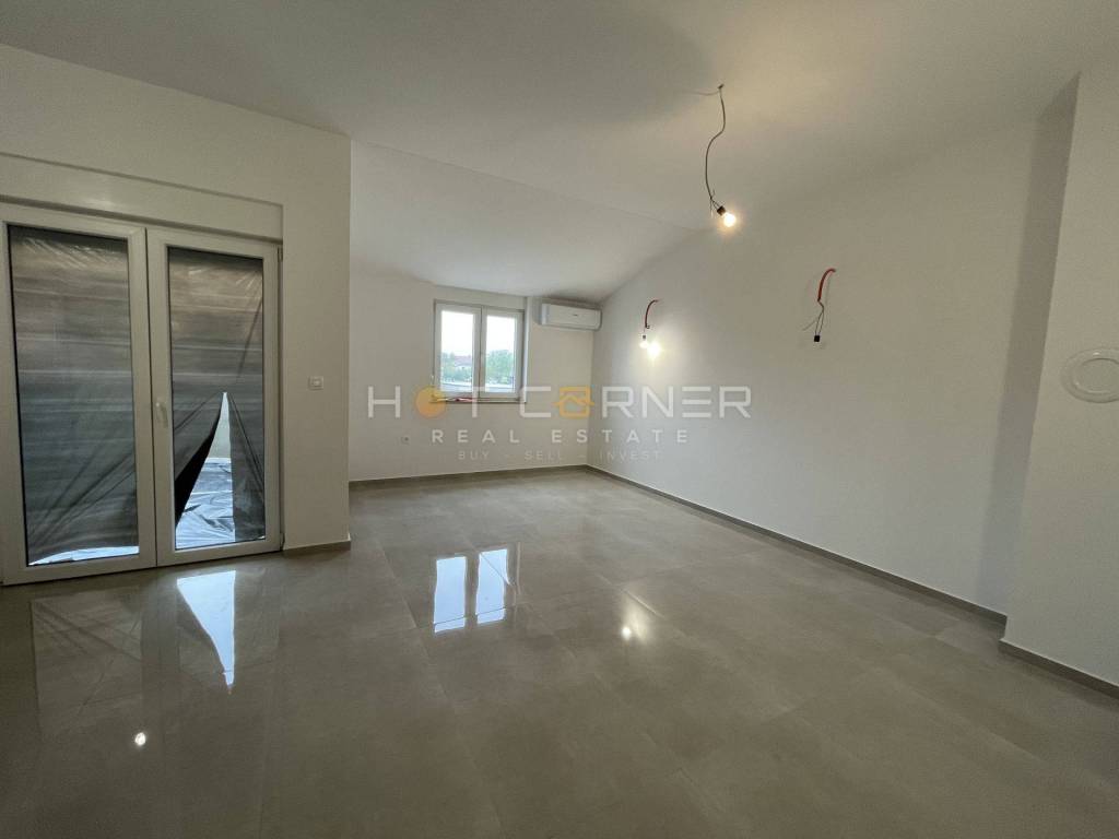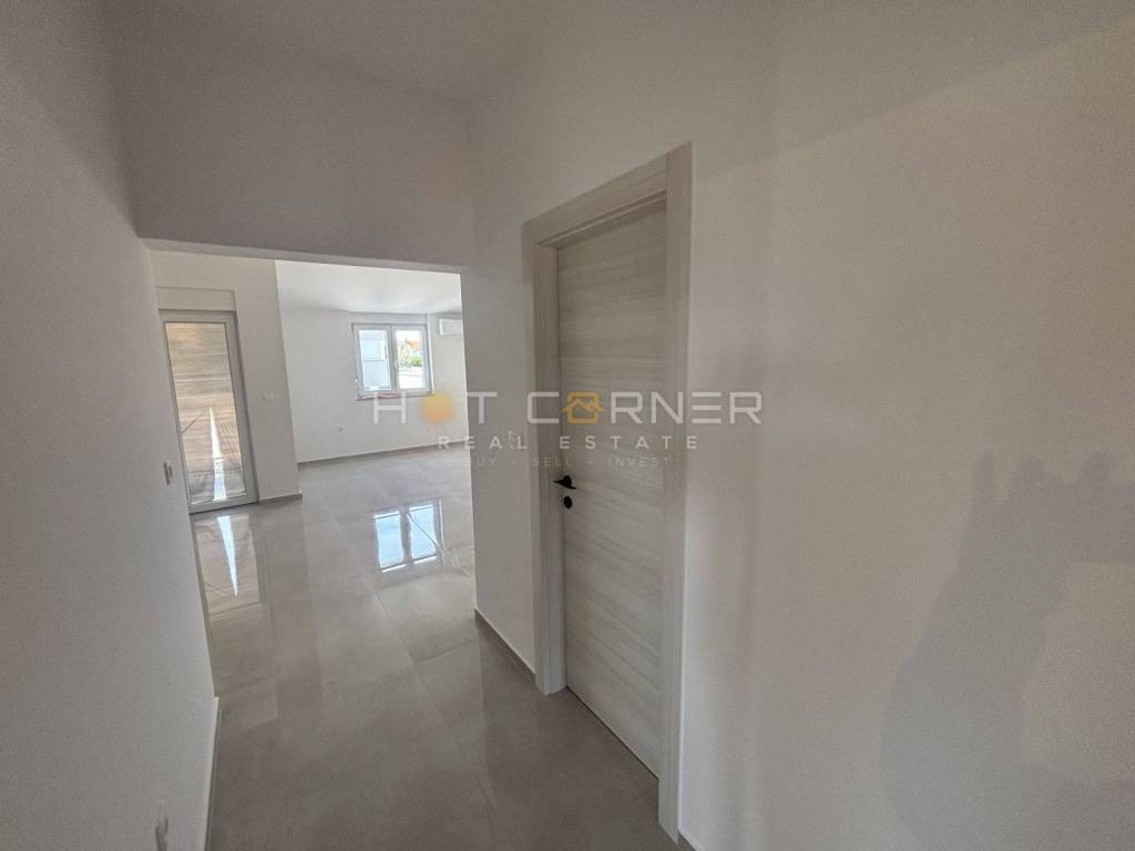 Opremljen je podnim grijanjem na dizalicu topline, što osigurava ugodnu temperaturu i energetsku učinkovitost tijekom cijele godine. Kuhinja je u potpunosti namještena, a sve prostorije opremljene su punjenim sobnim vratima koja doprinose izvrsnoj zvučnoj izolaciji. Prozori su opremljeni komarnicima, što omogućuje ugodno provjetravanje i komfor tijekom toplijih mjeseci. Posebna pažnja posvećena je toplinskoj izolaciji – zidovi su izolirani slojem od 10 do 15 cm, što dodatno pridonosi uštedi energije i kvaliteti stanovanja.