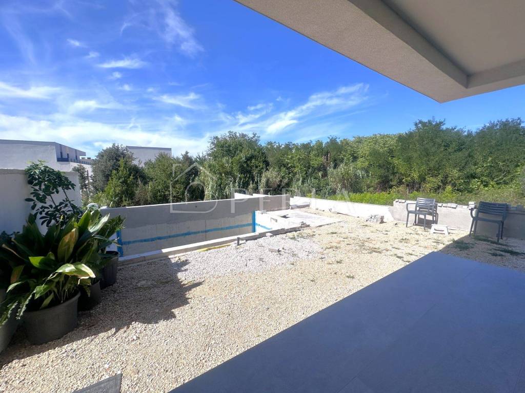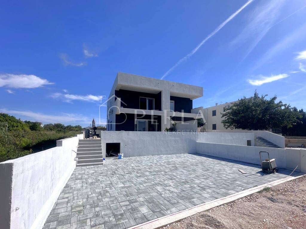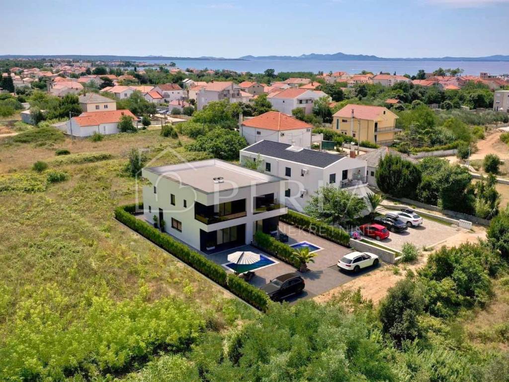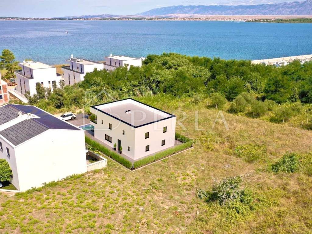 Prodaje se moderna duplex kuća u izgradnji s bazenom ukupne stambene površine 133 m2 na odličnoj lokaciji u mjestu Privlaka, s fantastičnim pogledom na more. Kuća je dvojna i prodaje se polovica nekretnine označena rozim okvirom. Stambena jedinica se rasprostire na dvije etaže: prizemlje i kat. U prizemlju se nalazi ulazni hodnik/predsoblje, kupaonica, spavaća soba te veliki open space prostor koji ujedinjuje prostranu kuhinju s blagovaonicom i dnevnim boravkom s izlazom na natkrivenu terasu ispred koje se nalazi bazen sa svojim lounge dijelom za odmaranje i izležavanje. Vila obiluje staklenim stijenama što omogućuje puno prirodnog svjetla, te pogled na more. Unutarnjim stepeništem se dolazi na kat kuće gdje su smještene tri spavaće sobe, dvije kupaonice te velika prostrana natkrivena terasa s koje možete uživati u beskrajnom pogledu na more. U izgradnji i opremanju objekta se koriste visoko kvalitetni materijali. Visoko učinkovita toplinska fasada. Kvalitetna vanjska pvc stolarija. Podovi će biti obloženi visoko kvalitetnim keramičkim pločicama. Cjelokupni objekt će biti opremljen sustavom grijanja i hlađenja putem multisplit klima uređaja s tim da će u kupaonice biti ugrađeno podno grijanje na struju te je u dnevnom boravku sproveden i dimnjak kao opcija za grijanje prizemlja. Bazeni će biti armirano betonski te će ujedno biti napravljena i priprema za zagrijavanje vode bazena. Ograđena i uređena okućnica sa prekrasnim bazenom i sunčalištem, dok su na parceli predviđena dva parkirna mjesta. Ova nevjerojatna kuća, nudi ne samo spektakularan pogled na more, već udoban i moderan prostor za život. Sama pozicija kuće je odlična jer se u okolici grade većinom urbane vile s bazenima i kuće za odmor. Zbog svoje odlične lokacije i iznimnog sadržaja ova kuća nudi mogućnost za stvaranje kvalitetnog obiteljskog života kao i idealnu priliku za investiranje u turističke svrhe.
