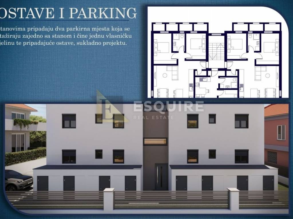 Stanovima pripadaju 2 vanjska parkirna mjesta koja se etažiraju zajedno sa stanom i čine jednu vlasničku cjelinu te pripadajuće ostave, sukladno projektu.