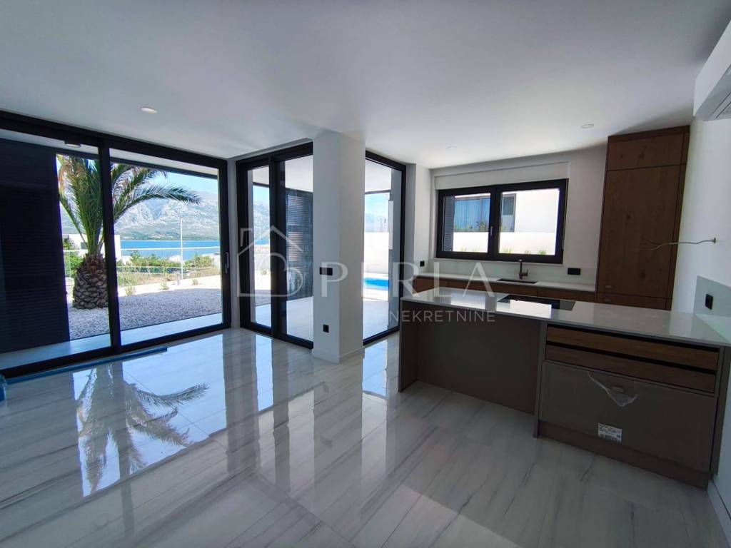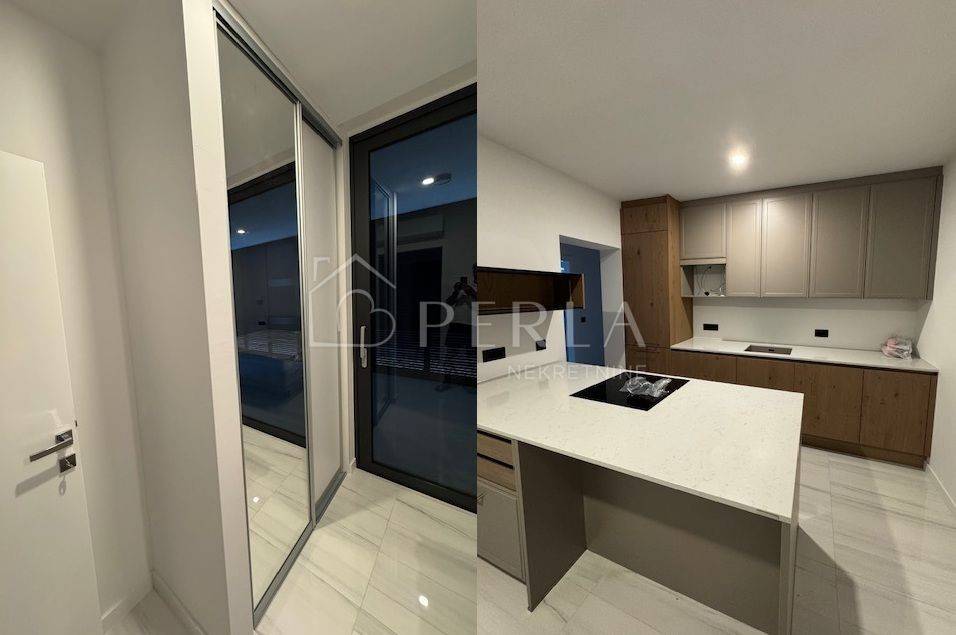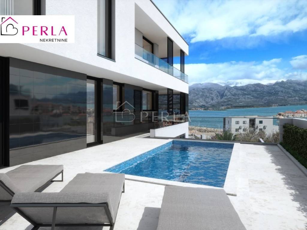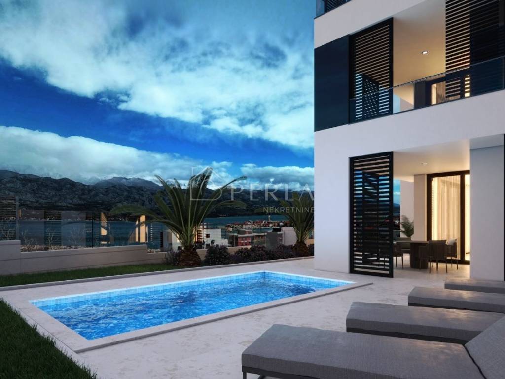 Apartmani zahvaljujući dugogodišnjem iskustvu investitora i njegovog tima ljudi koji su uključeni u projekt su opremljeni kvalitetnim materijalima i opremom: -Baumit bijela fasada sa 15cm toplinske izolacije -dio fasade obložen u crni porculan sa efektom ogledala -svi ogradni zidovi obloženi u Brački kamen -staze u vrtovima i nenatkrivene terase popločane Semmelrock pločama -aluminijske klizne grilje na terasama -schuco Ase60 podiznoklizne panoramske stijene od poda do stropa -reflex gray kaljeno-laminirano staklo u panoramskim stijenama -kompletno podno grijanje -kompletna klimatizacija stana -podovi unutar stana popločani španjolskim porculanom Golden Blanco dim.1.2*1.2 -zidovi kupaonica obloženi španjolskim porculanom Golden Blanco dim.60*1.2 -walk in-tuš kabine popločane protukliznim mozaikom Golden Blanco dim.30*30 -terase, balkoni popločane protukliznim španjolskim porculanom Golden Blanco mat,dim.60*120 -ugradbena kupaonska sanitarija Hansgrohe -ugradbeni vodokotlici Tece sa sporospustajucom wc daskom -okućnica rasvijetljena led rasvjetom Iznimno mirna lokacija s panoramskim pogledom na more i planinu Velebit. Vlasništvo uredno 1/1.