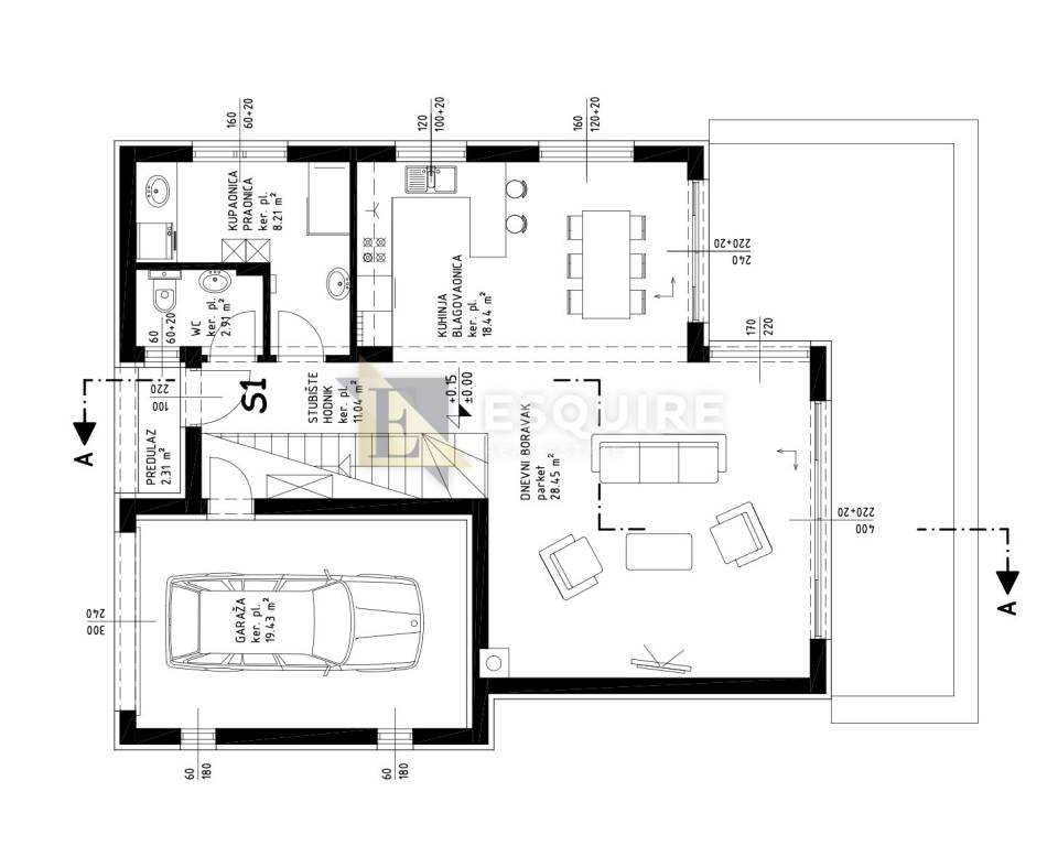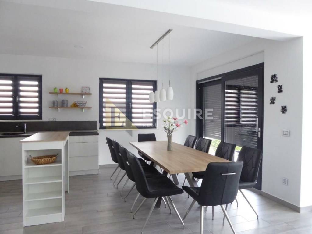 - ulaznog prostora, - kupatila, - wc-a, - ostave, - garaže, - kuhinje, blagavaonice i dnevnog boravka iz kojeg se dalje izlazi na terasu i dvorište / sunčalište s bazenom.