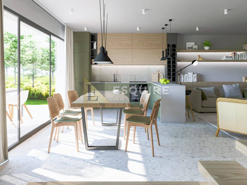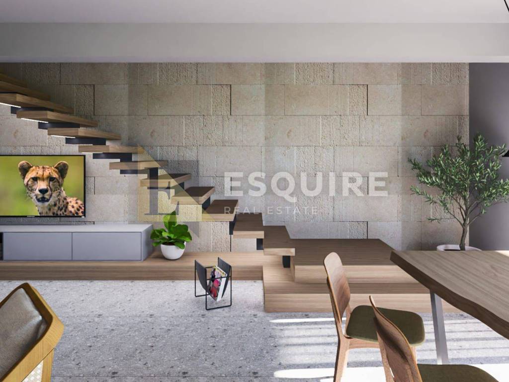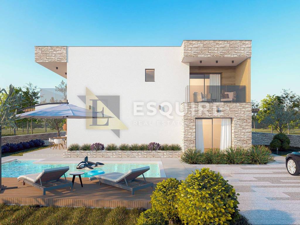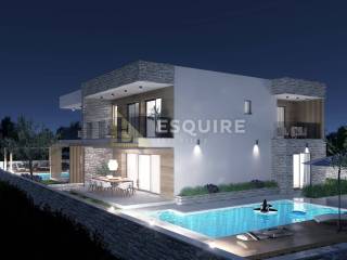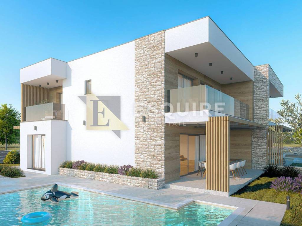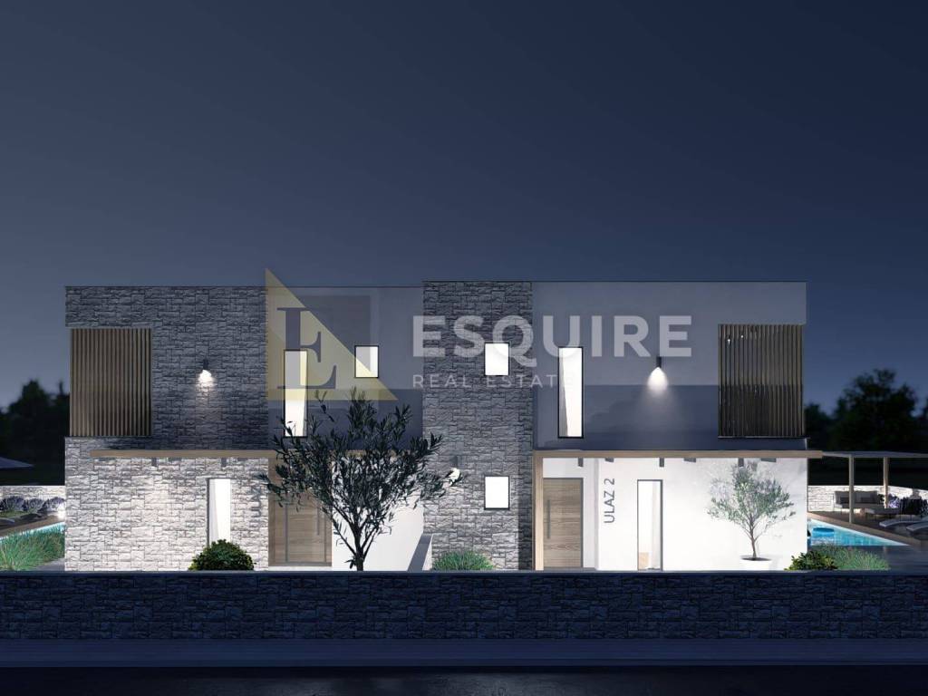 Opis projekta: - Projekt predviđa izgradnju dvije luksuzne stambene jedinice, svaka s vlastitim privatnim vanjskim prostorom i bazenom. - Moderni arhitektonski koncept s ravnim krovom i elegantnom kombinacijom kamena, drva i bijelih fasadnih elemenata - Velike staklene stijene koje omogućuju obilje prirodnog svjetla - Natkrivene terase na katu s pogledom na bazen i dvorište - Prostrane natkrivene vanjske blagovaonice u prizemlju - Dva privatna bazena, svaki okružen uređenim sunčalištem - Drvene decking platforme uz bazene - Prostrane terase za sunčanje, lounge zonu i postavljanje ležaljki - Uređena hortikultura s maslinama, niskim mediteranskim raslinjem i ambientalnom rasvjetom - Mogućnost izdvajanja privatnih dijelova dvorišta za svaku jedinicu
