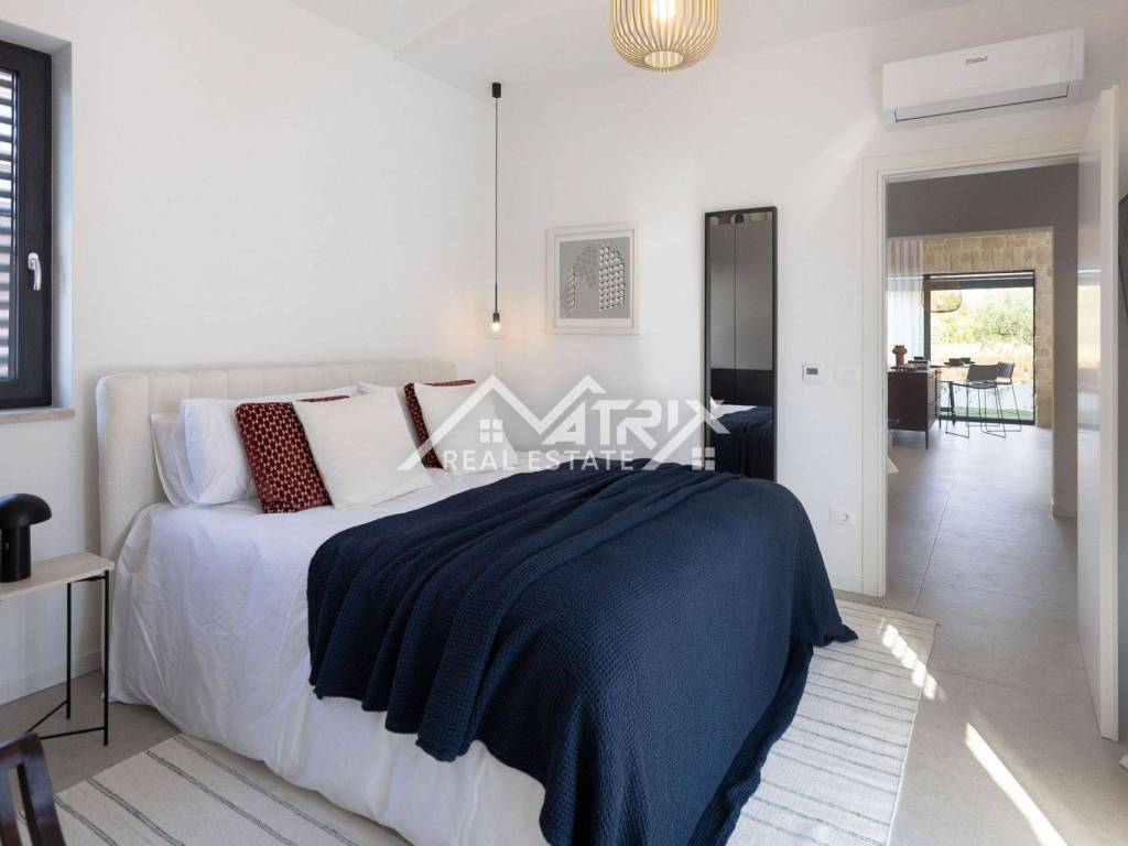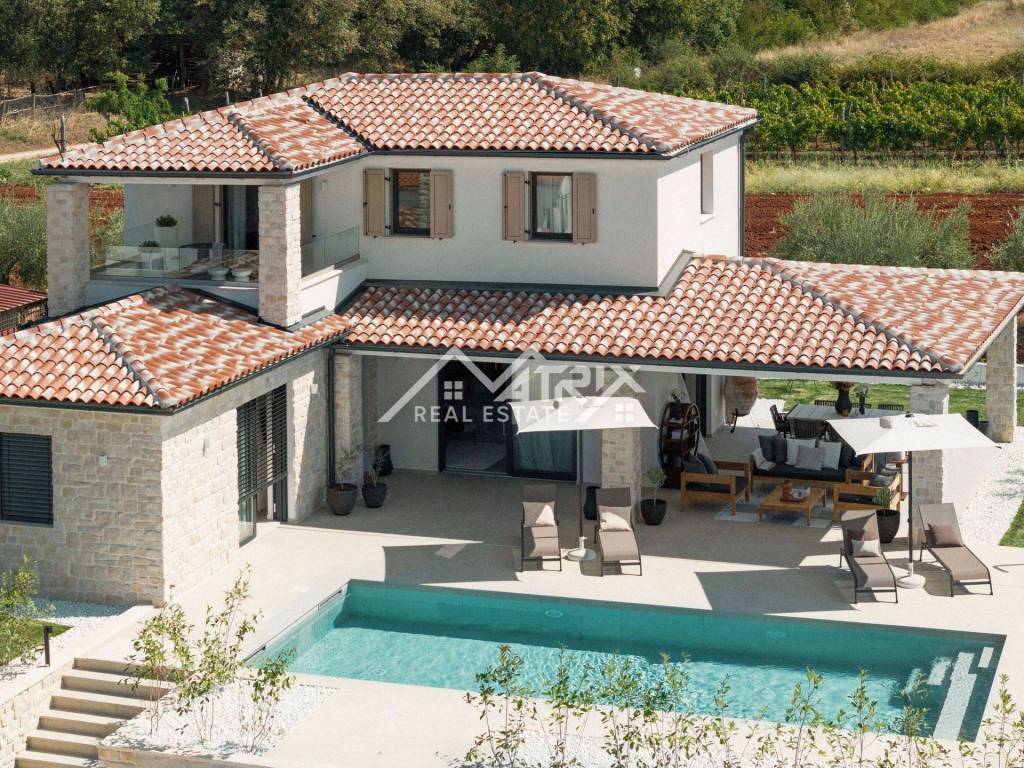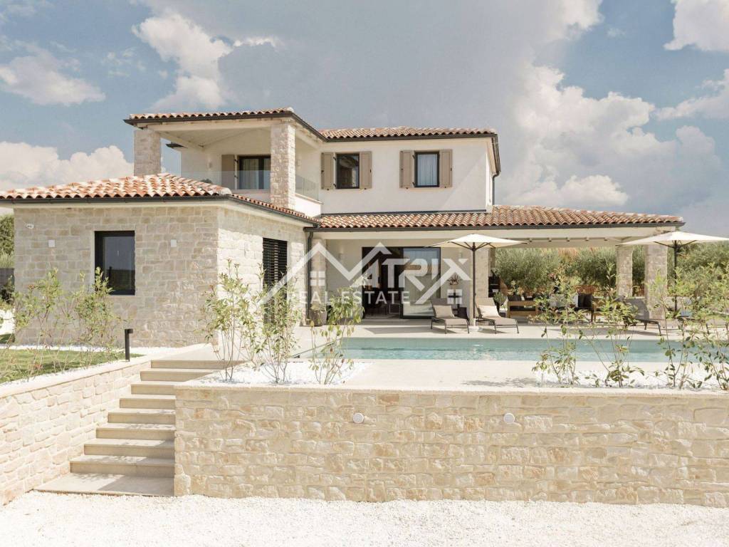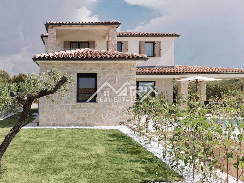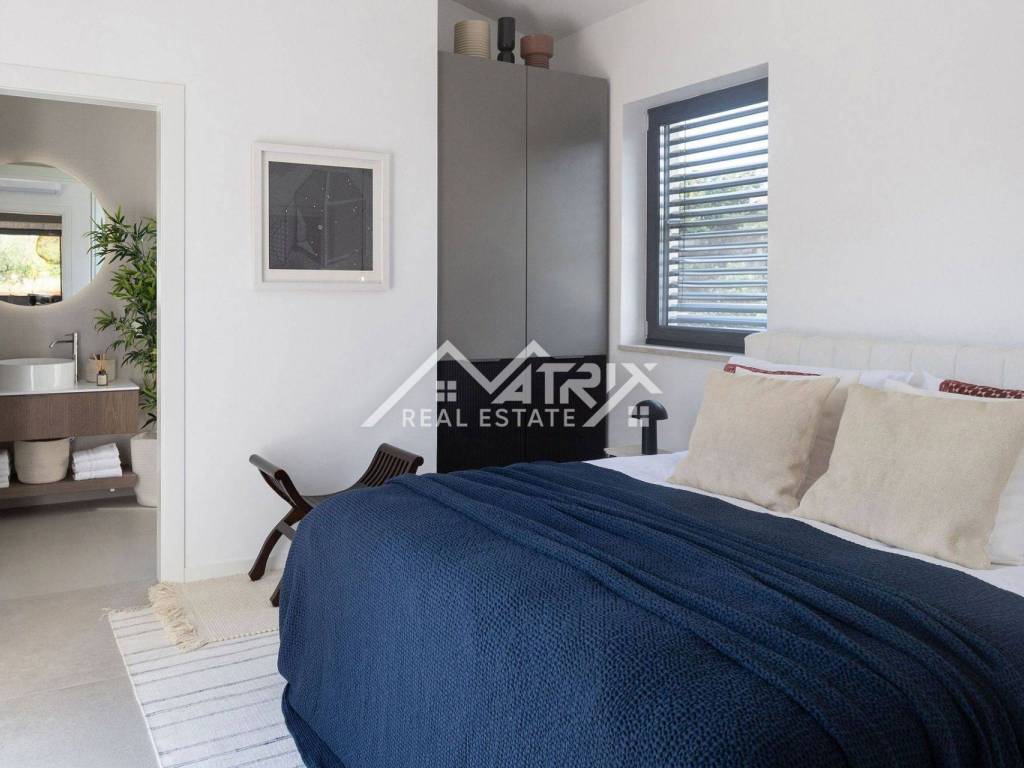 Ova impresivna samostojeća vila raspoređena je na prizemlju i katu. Prizemlje obuhvaća prostrani ulazni prostor, potpuno opremljenu kuhinju s modernim uređajima te dnevni boravak s izlazom na prostranu natkrivenu terasu. Terasa je pravo malo utočište opremljeno ljetnom kuhinjom, lounge prostorom za opuštanje i spektakularnim pogledom na grijani bazen od 36 m2 sa sunčalištem. Na istom katu smještena je spavaća soba s privatnom kupaonicom, gostinjski WC i tehnička soba.