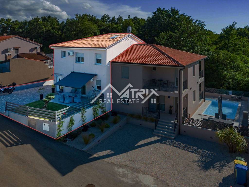Na prodaju je predivna, novija obiteljska dvojna kuća u mirnom dijelu. Kuća se prostire na 154 m2 i sastoji se od prizemlja i kata, pažljivo dizajnirana za udoban život.