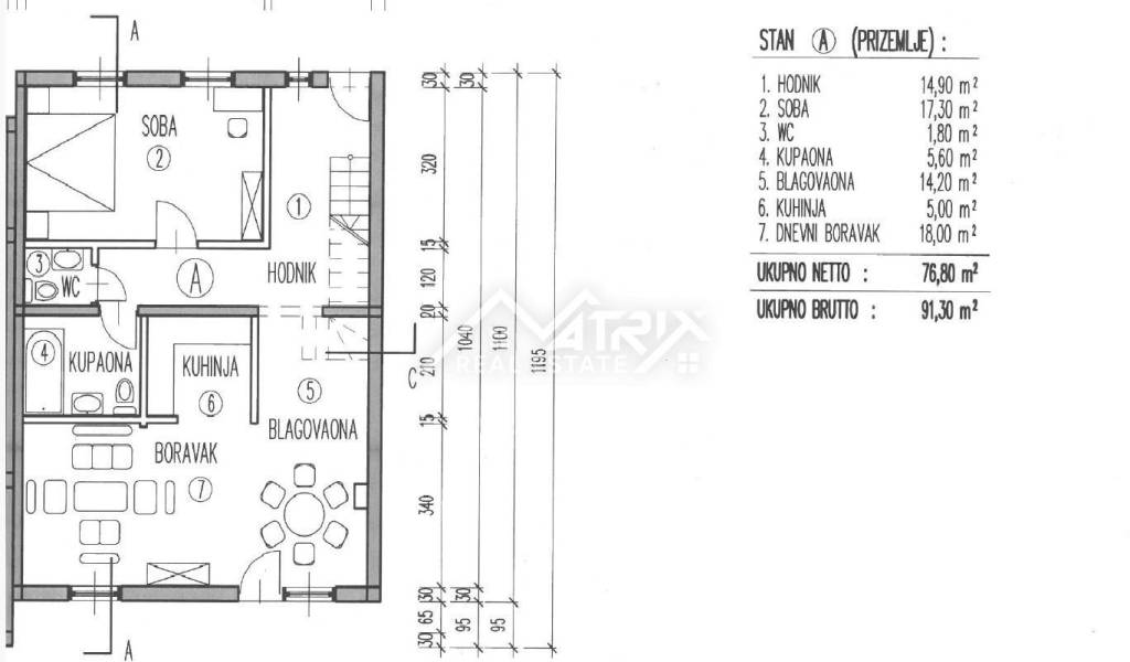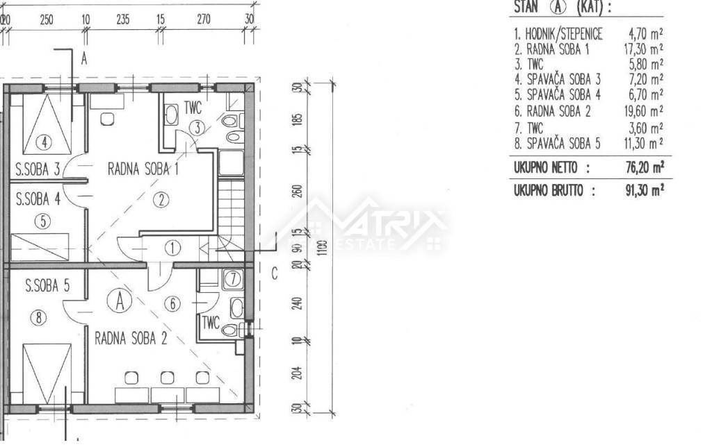 Prizemlje se sastoji od jedne prostrane stambene jedinice koja uključuje veliki dnevni boravak, blagovaonicu i kuhinju u open space konceptu, tri udobne spavaće sobe, moderno kupatilo i dodatni WC. Na kat se dolazi odvojenim stepenicama gdje se nalaze dva apartmana. Prvi apartman se sastoji od dnevnog boravka i kuhinje, dvije spavaće sobe i kupatila, dok drugi apartman ima dnevni boravak, jednu spavaću sobu i kupatilo.