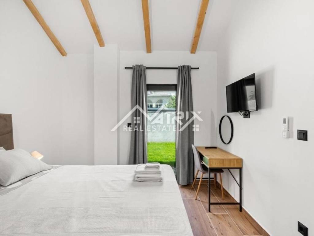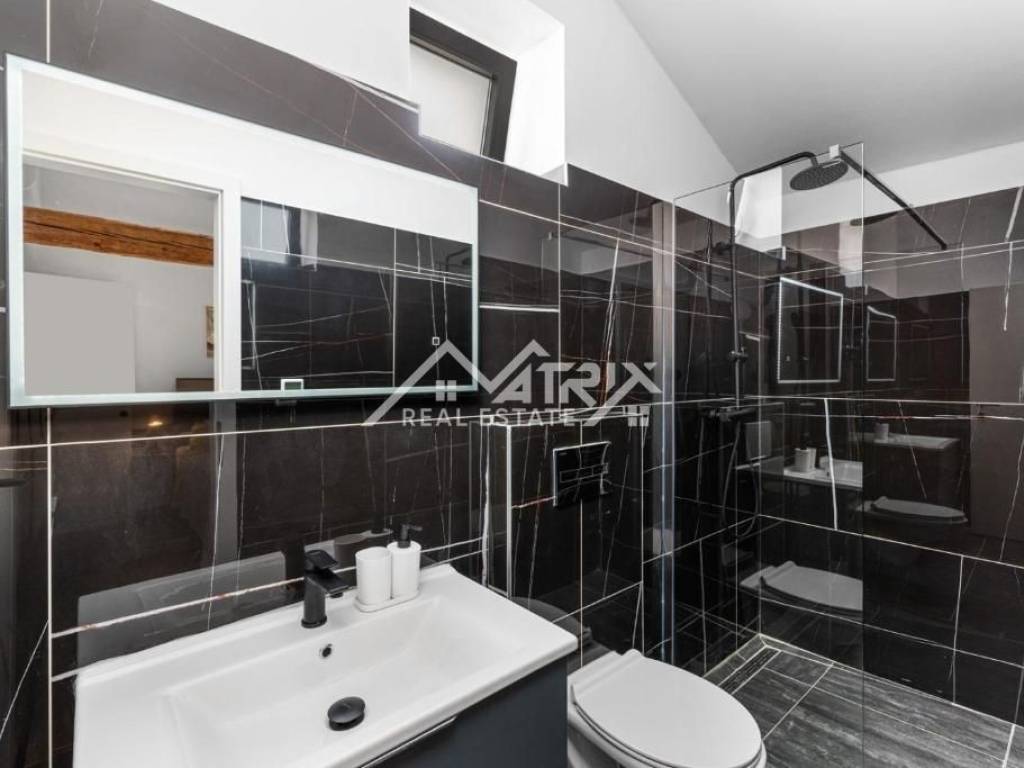 Kuća se prostire na dvije etaže. U prizemlju ćete pronaći prostranu kuhinju s blagovaonicom, udoban dnevni boravak, kupaonicu, kotlovnicu s praonicom rublja i spavaću sobu s izravnim izlazom u dvorište. Elegantne drvene unutarnje stepenice vode na prvi kat, gdje se nalaze dvije spavaće sobe, svaka sa vlastitom kupaonicom.