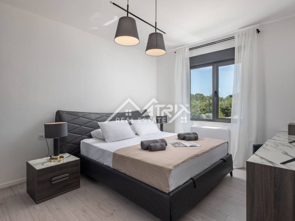Vila se prostire na 300 m² stambenog prostora, neto 210 m2, dok okućnica od 900 m² omogućuje uživanje u mirnom okruženju s pogledom na bujno zelenilo. U prizemlju se nalazi jedna spavaća soba s vlastitom kupaonicom, dok su na katu smještene tri sobe, od kojih jedna također ima privatnu kupaonicu, dok druge dvije dijele zajedničku kupaonicu. Sve sobe opremljene su king size krevetima dimenzija 180x200 cm, pružajući maksimalnu udobnost i privatnost. Svaka soba pažljivo je dizajnirana s ciljem stvaranja toplog i pozivajućeg ambijenta.