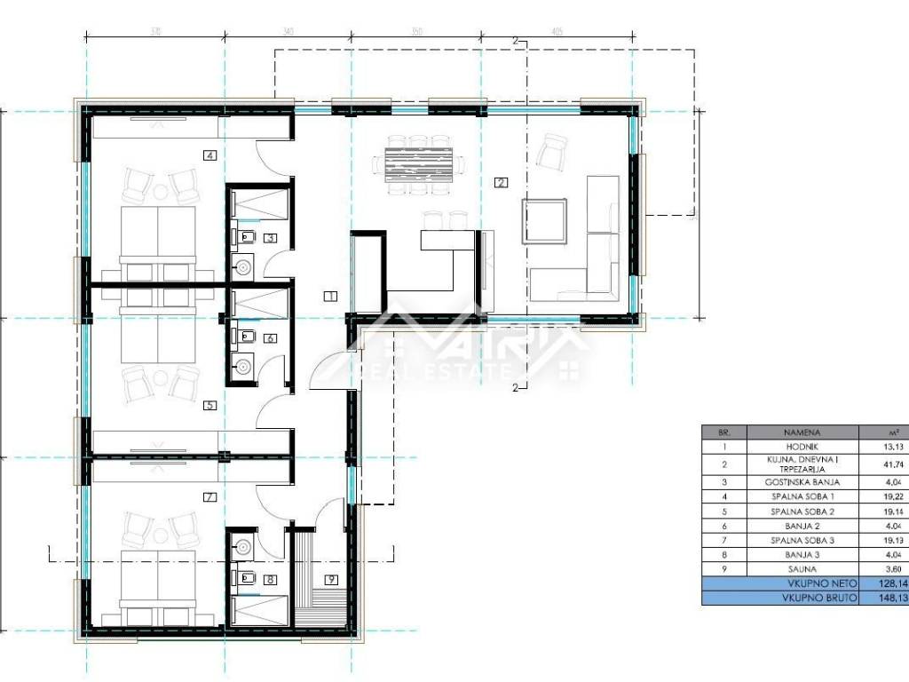 Za ovo zemljište izrađen je idejni projekt za modernu prizemnicu koja obuhvaća dnevni boravak, kuhinju i blagovaonicu, tri spavaće sobe, svaka s vlastitom kupaonicom, mali gostinjski WC te vanjski bazen.