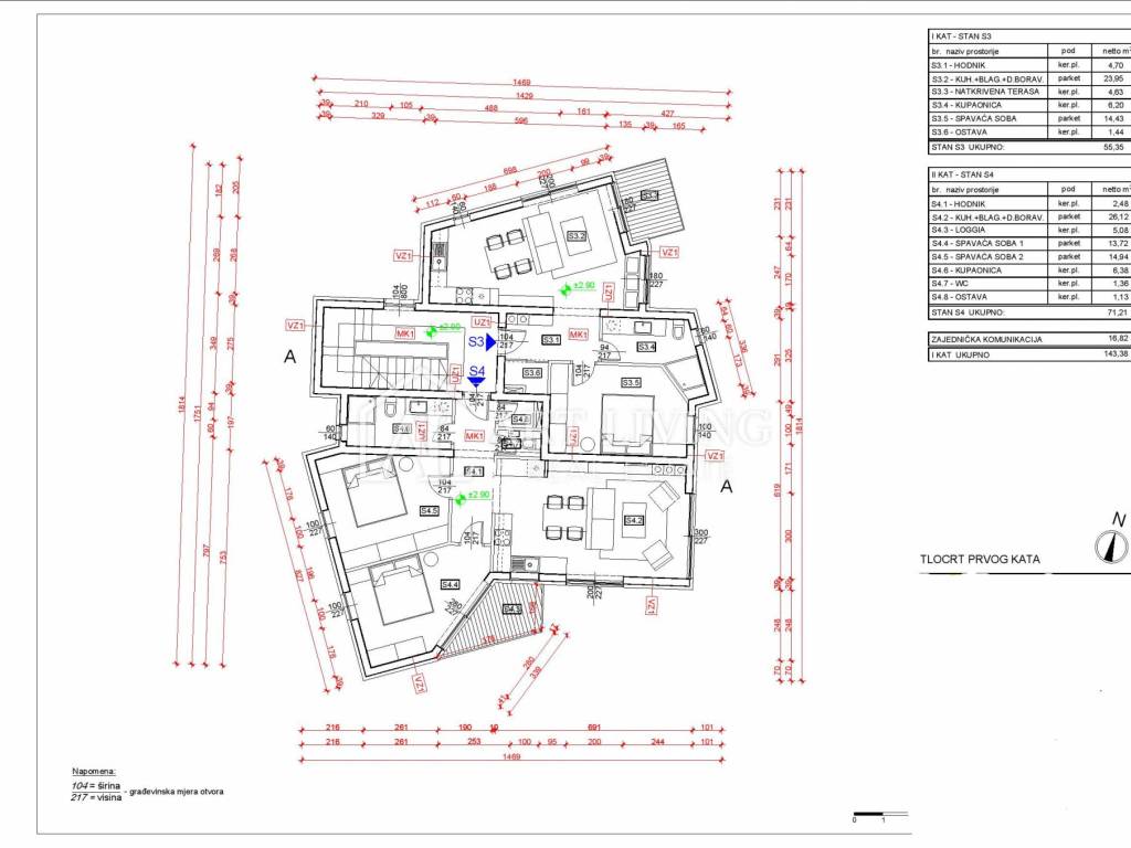 Stan na 1. katu ukupne površine 71,21 m2 sastoji se od hodnika, open-space dnevnog boravka sa kuhinjom i blagovaonicom, 2 spavaće sobe, ostave, wc-a, kupaonice i natkrivene terase površine 5,08 m2..