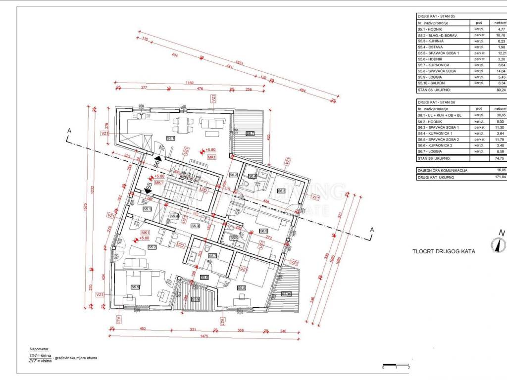 Stan na 2. katu ukupne površine 80,24 m2 sastoji se od hodnika, dnevnog boravka sa blagovaonicom, kuhinje, 2 spavaće sobe, kupaonice, ostave te balkona površine 6,34 m2 i loggie površine 5,45 m2.