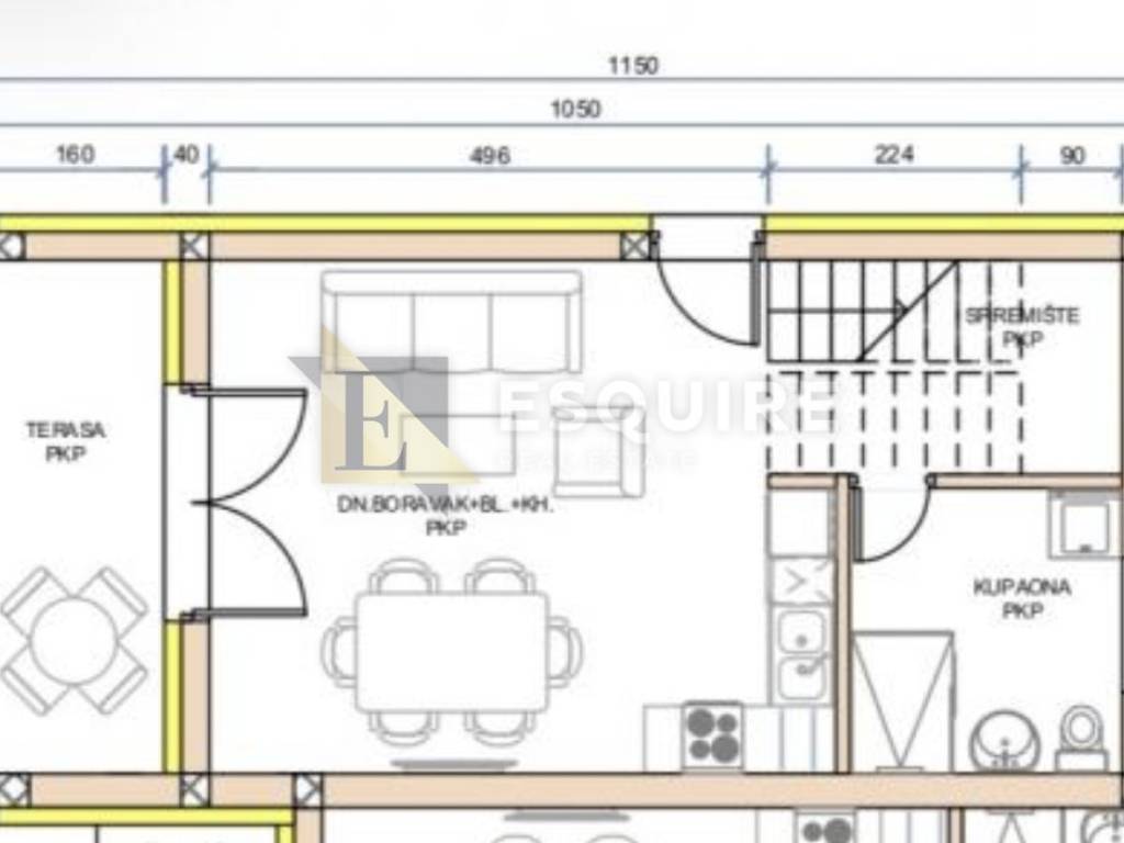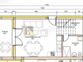 - Prizemlje: prostrani dnevni boravak s kuhinjom i blagovaonicom, kupaonica, izlaz na terasu