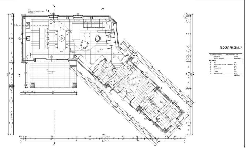 U prizemlju se nalaze dnevni boravak s kuhinjom i blagovaonicom, jedna spavaća soba, toalet, kupaonica, tehnička soba i natkrivena terasa. Na katu su dvije spavaće sobe, dvije kupaonice i terase.