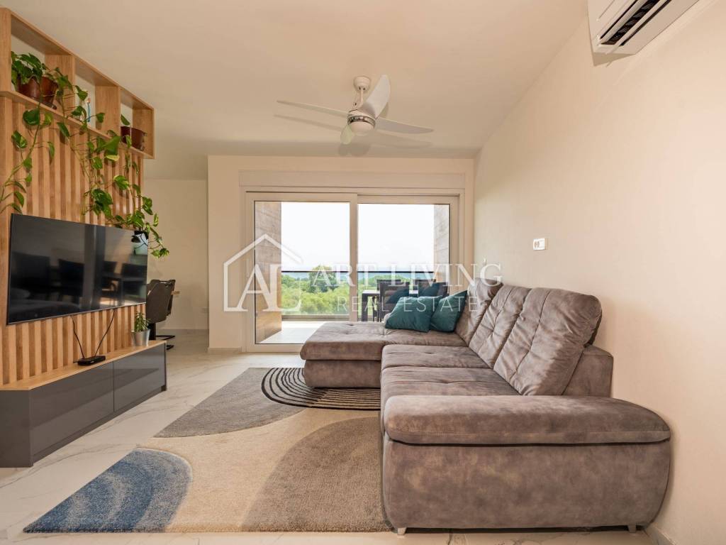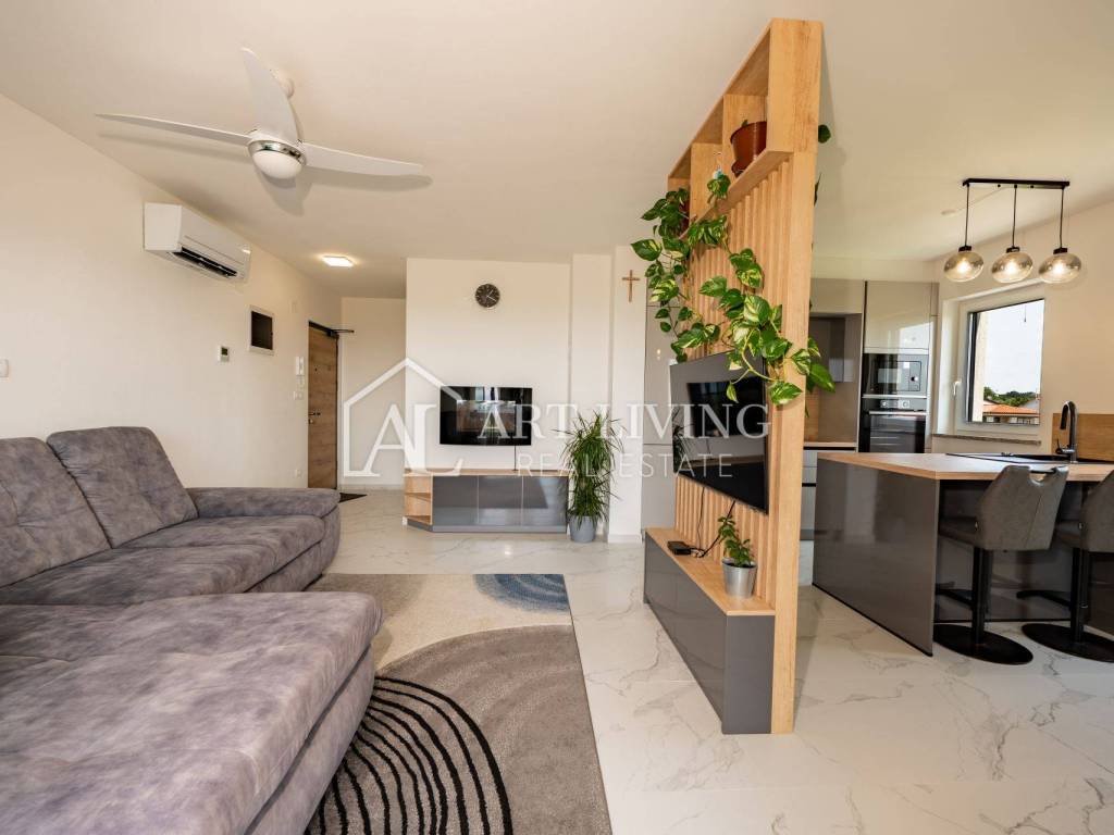 Stan površine 73,49 m2 sastoji se od prostranog dnevnog boravka s kuhinjom i blagovaonicom otvorenog tipa s izlazom na prekrasnu terasu površine 8,71 m2 s koje se pruža panoramski pogled na more i obližnje maslinike. Stan također ima 2 spavaće sobe, kupaonicu i degažman s garderobnim ormarom. Jedna od spavaćih soba također ima pristup na vlastitu terasu površine 5,23 m2