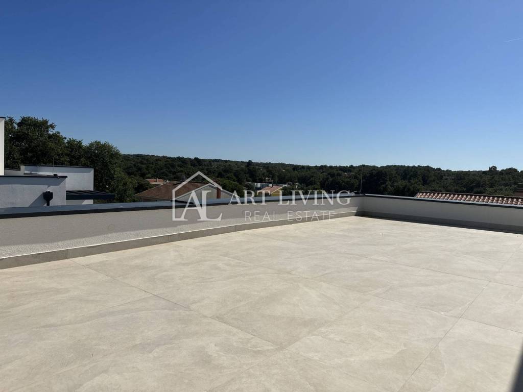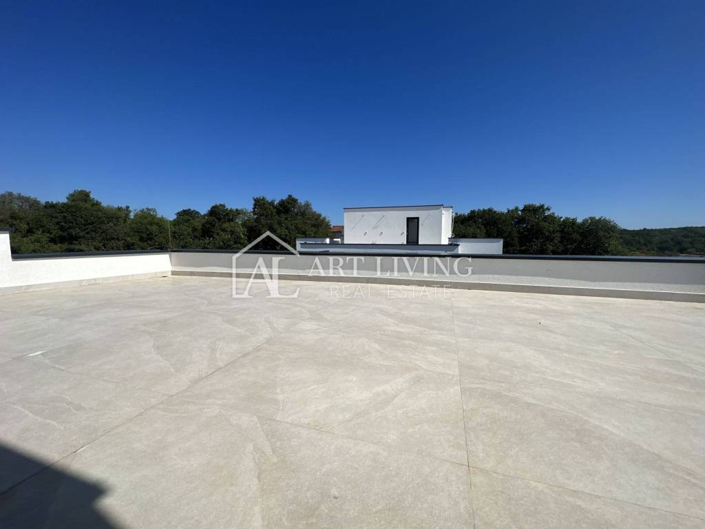 Kuća ima i prelijepu krovnu terasu površine 50 m2 s lijepim pogledom na more. Na terasi se nalaze svi priključci za struju i vodu.