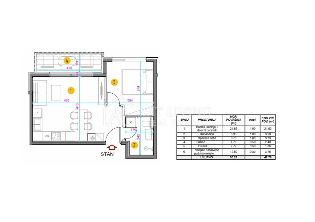 Stan je smješten na 3. katu nove moderne zgrade sa liftom. Ukupna neto površina stana iznosi 42,76 m2. Sastoji se od dnevnog boravka sa kuhinjom i blagovaonicom, kupaonice i spavaće sobe. Iz dnevnog boravka se izlazi na balkon površine 4,79 m2. Stanu pripada spremište i jedno vanjsko natkriveno parkirno mjesto.