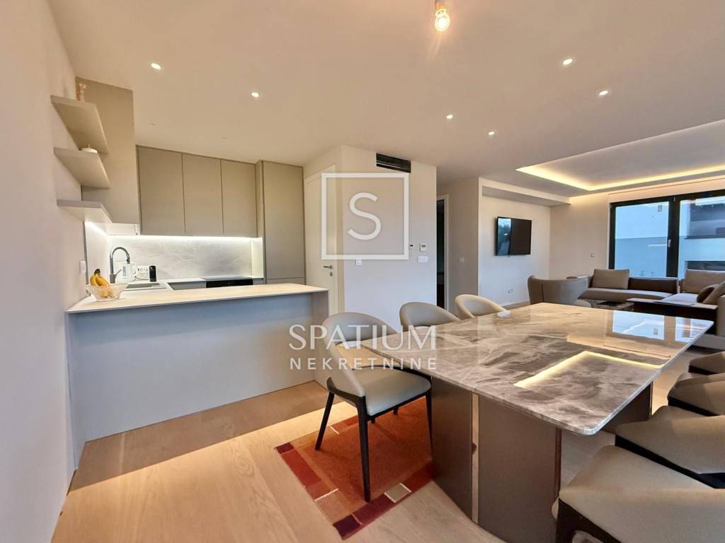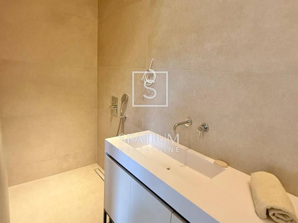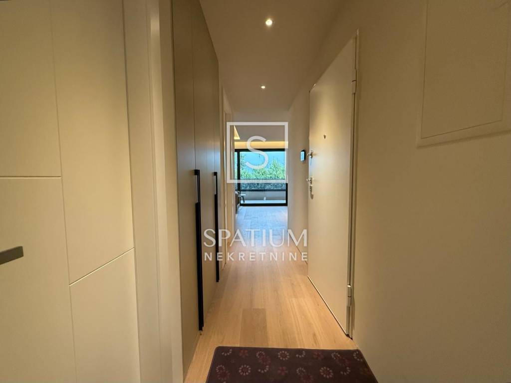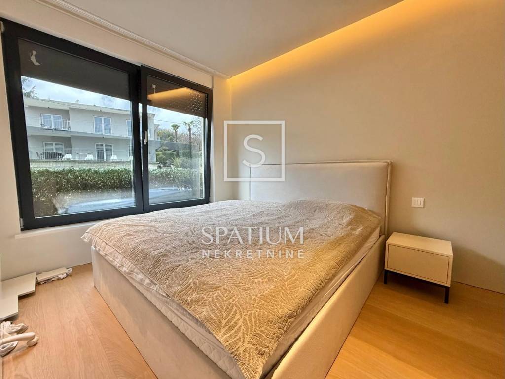 LOVRAN, u ponudi je moderan stan u novogradnji, površine 105 m2. Sastoji od otvorenog dnevnog boravka s kuhinjom i blagovaonom, dvije spavaće sobe, kupaonice, toaleta, "master spavaće sobe" s pripadajućom garderobom i kupaonicom, vešeraja i hodnika. Iz dnevnog djela izlazi se na prostrani osunčani balkon. Stan je opremljen vrhunskim namještajem i dosad nije bio useljen. Uz stan dolazi i natkriveno parkirno mjesto ispred zgrade, kao i spremište u podrumu.